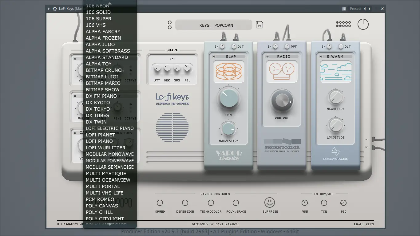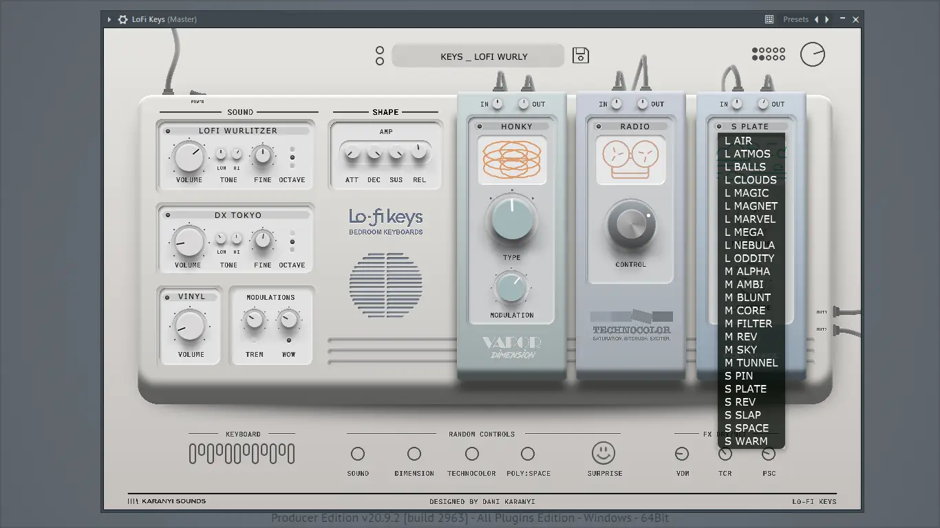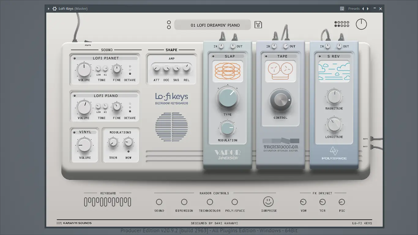Плагин Lofi Keys от Karanyi Sounds предлагает музыкантам и продюсерам аутентичное lo-fi звучание с элементами винтажной текстуры и теплоты аналоговых носителей. Инструмент объединяет классические электропианино и синтезаторы, записанные на кассеты, VHS и винил, обеспечивая глубокую атмосферу и ностальгическую окраску. Простой интерфейс позволяет быстро настраивать звуки, добавляя шумы старых носителей и эффекты модуляции.