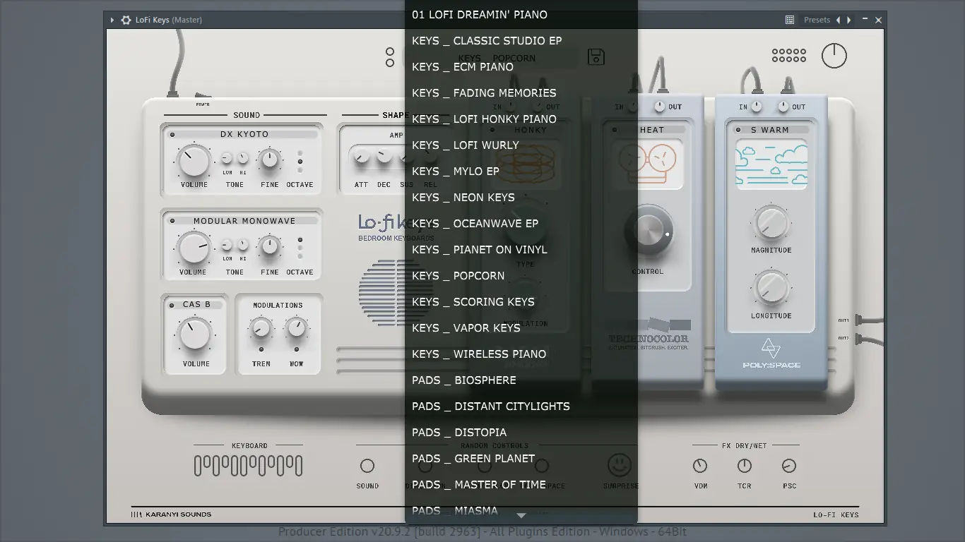 Плагин Lofi Keys создан для тех, кто ценит атмосферу уюта, теплоту аналогового звука и творческую свободу. Он включает в себя 40 различных звуковых источников, среди которых — легендарные электрические пианино и аналоговые синтезаторы, включая отмеченное наградами акустическое пианино Blüthner. Все инструменты были записаны с использованием старинного оборудования, что придаёт каждому звуку уникальную текстуру, характерную для lo-fi эстетики.