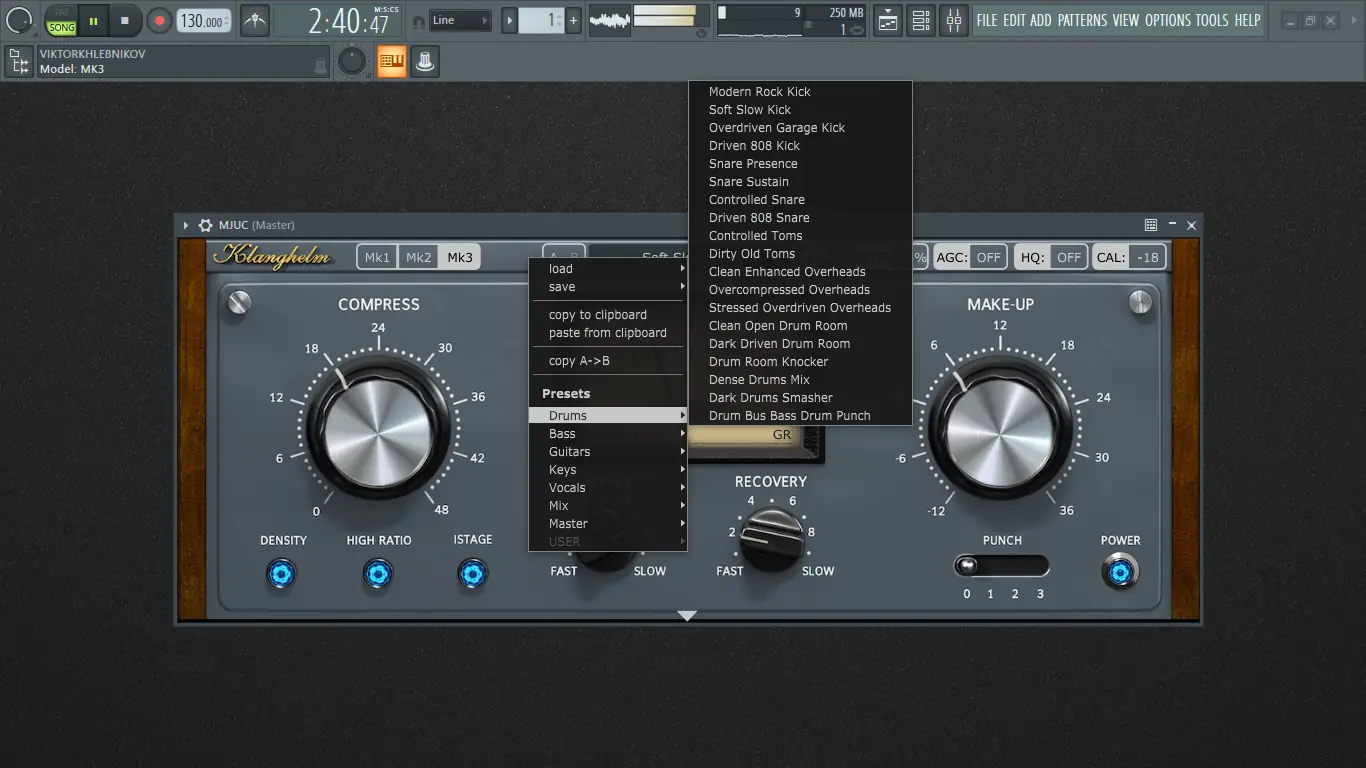 Использование Klanghelm — MJUC начинается с выбора одной из трёх моделей в зависимости от требуемого характера сжатия. Параметры Threshold, Ratio, Attack и Release позволяют точно настроить динамический отклик, а переключатель Density в модели Mk2 изменяет поведение времени восстановления. Ручки DRIVE и TIMBRE дают возможность формировать тембр: первая добавляет насыщение от ламп и трансформаторов, вторая — корректирует спектральную окраску. Для достижения максимальной прозрачности или, наоборот, яркой цветности, рекомендуется экспериментировать с комбинацией этих параметров в зависимости от типа сигнала — вокала, барабанов, баса или мастер-шины.