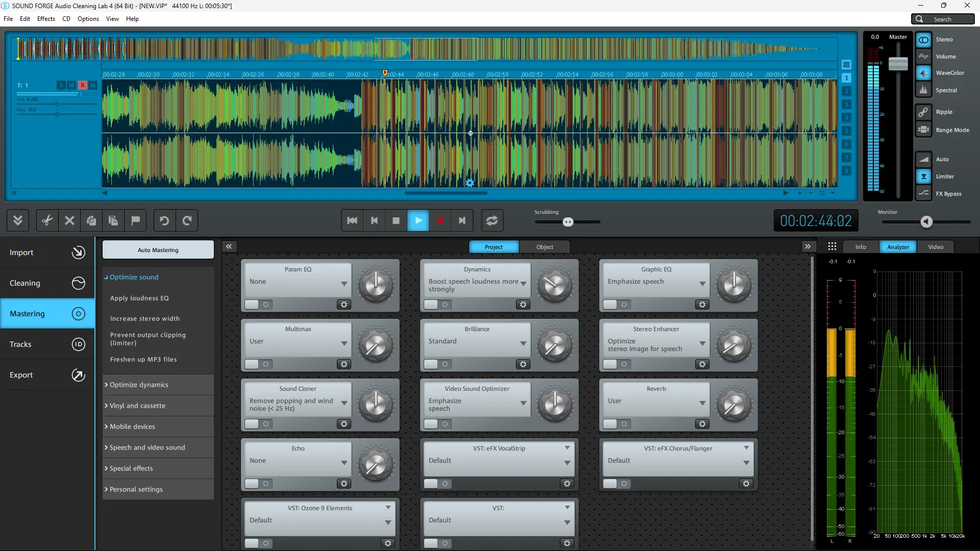 Программа MAGIX SOUND FORGE Audio Cleaning Lab предназначена для высокоточной очистки, восстановления и редактирования аудиозаписей. Она позволяет оцифровывать старые носители, устранять шумы и помехи, оптимизировать звук речи и музыки, а также выполнять профессиональный мастеринг. Инструмент подходит как для начинающих, так и для опытных пользователей, работающих с архивными записями, подкастами или видео.