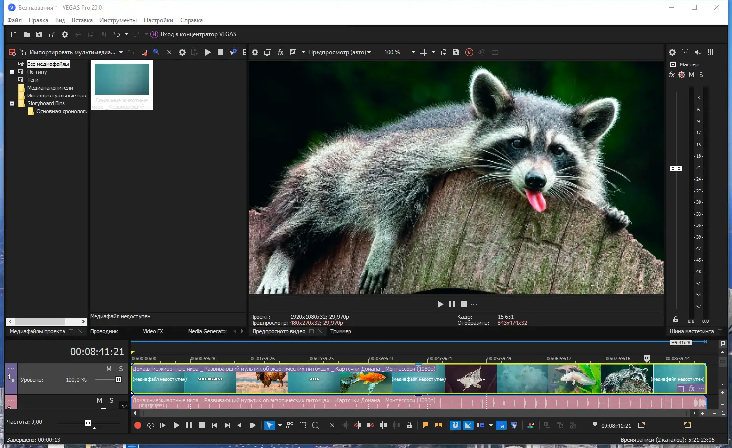 Работа с MAGIX Vegas начинается с импорта медиафайлов в проект, где они размещаются на временной шкале с возможностью точного позиционирования. Каждый видеоклип можно обработать с помощью фильтров, масок, эффектов наложения и анимированных ключевых кадров. Цветокоррекция выполняется через журнал градации с кривыми RGB, коррекцией белых и чёрных точек, а также с применением LUT-таблиц. Аудиодорожки редактируются отдельно, с возможностью автоматизации громкости, панорамирования и применения звуковых эффектов.