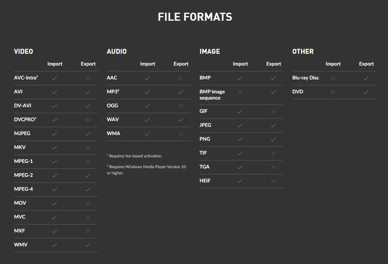 - Поддержка 8K Ultra HD и профессиональных кодеков, таких как HEVC, AVC и ProRes, позволяет работать с высококачественным исходным материалом без необходимости конвертации в прокси-форматы.