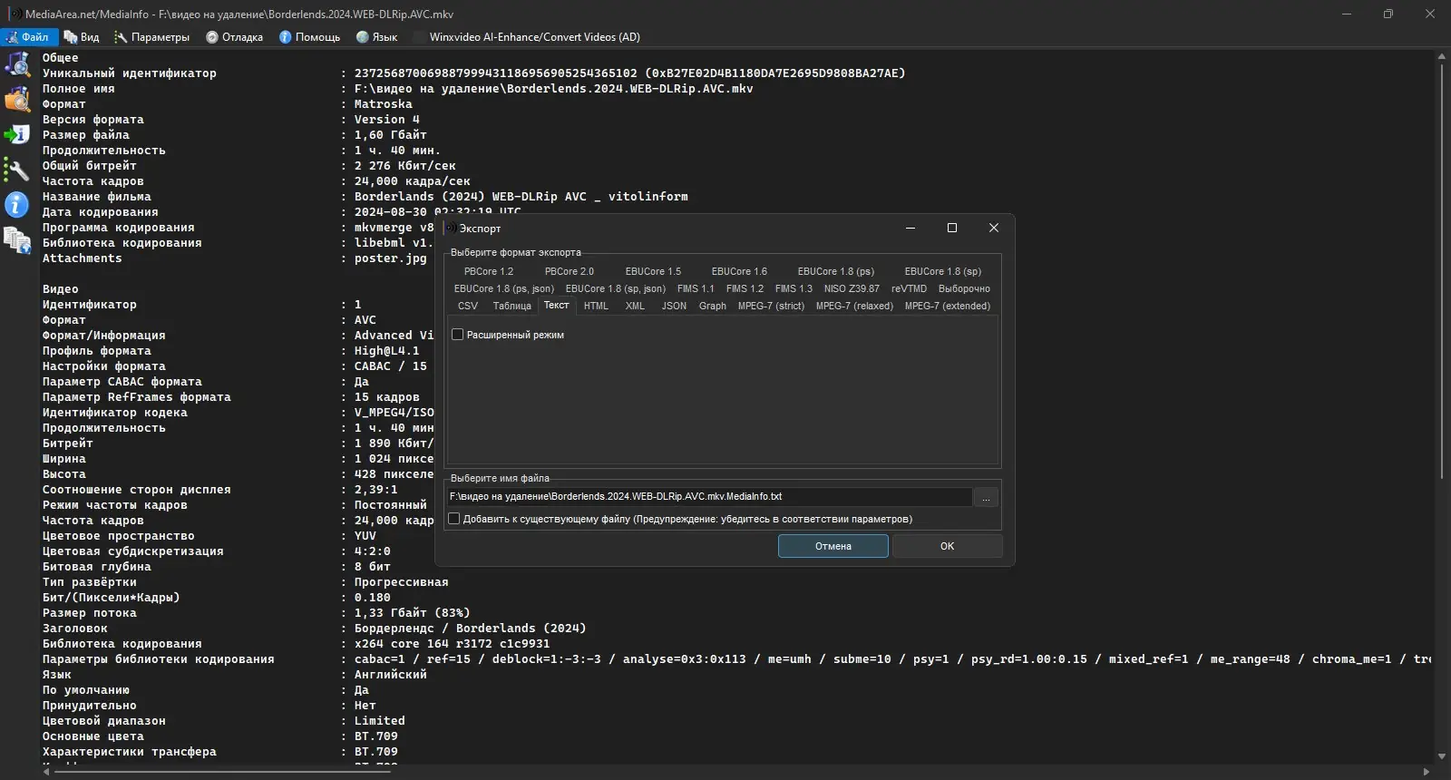 MediaInfo — это инструмент для просмотра технических сведений о медиафайлах, включая видео и аудио. Программа отображает детальную информацию о кодеках, форматах, продолжительности, битрейте, языке дорожек и других параметрах. Поддержка широкого спектра форматов делает её незаменимой для работы с мультимедиа.