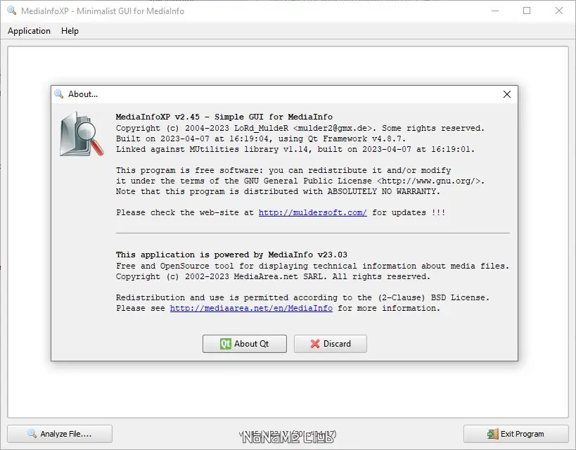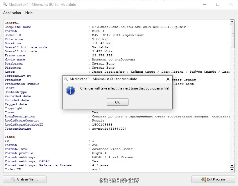MediaInfoXP разработан как минималистичный графический интерфейс для инструмента MediaInfo, что обеспечивает простоту и функциональность. Проект создан с нуля разработчиком LoRd_MuldeR и распространяется под лицензиями GPL и LGPL, что гарантирует свободу использования и модификации. Программа поддерживает широкий спектр форматов, включая MKV, MP4, AVI, FLV, MOV, WMV, MP3, AAC, FLAC и многие другие, что делает её универсальным инструментом для работы с медиаконтентом.
