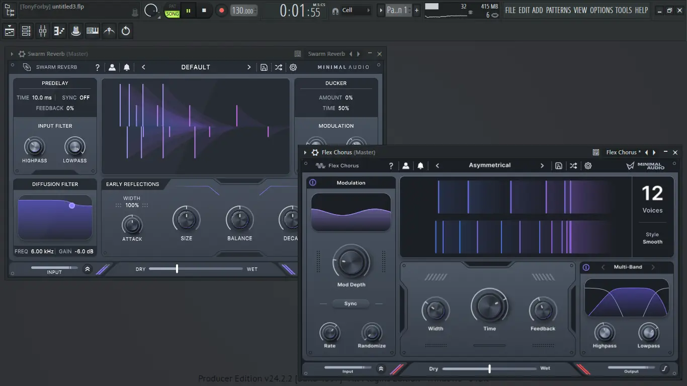 - Flex Chorus добавляет стереоширину и объём, используя продвинутые алгоритмы модуляции с плавным переходом между режимами.