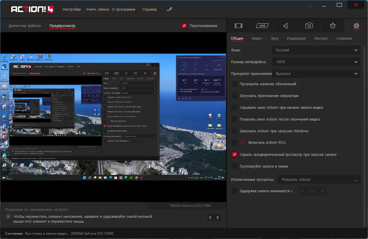 Интерфейс Mirillis Action интуитивно понятен и не требует глубоких технических знаний для начала работы. После запуска приложения пользователь может выбрать нужный режим записи — полный экран, отдельное окно или заданную область. Настройки аудиовхода позволяют подключить микрофон и веб-камеру, а также регулировать уровень громкости системного звука и голоса. Перед началом записи доступен предварительный просмотр, что помогает избежать ошибок при настройке источников.