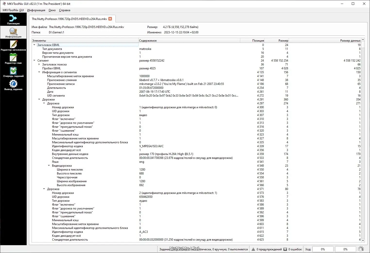 MKVToolNix — это мощный и гибкий набор утилит для создания, редактирования и анализа файлов в формате MKV. Программа позволяет объединять, разделять, редактировать контейнеры, добавлять или удалять дорожки, включая видео, аудио и субтитры. Интерфейс доступен на русском языке, что делает использование инструмента удобным для русскоязычных пользователей.
