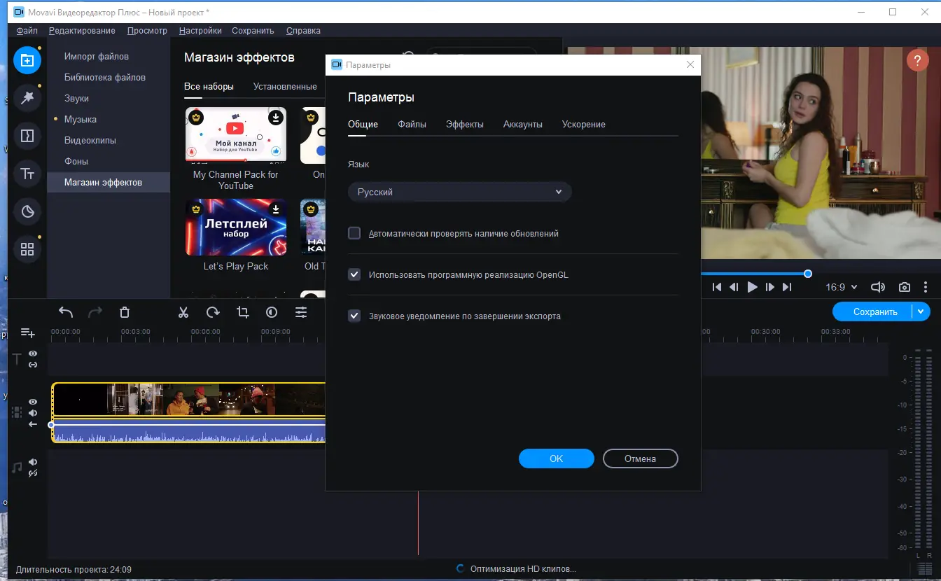 - Редактирование звукового сопровождения с возможностью импорта музыки и записи озвучки через микрофон