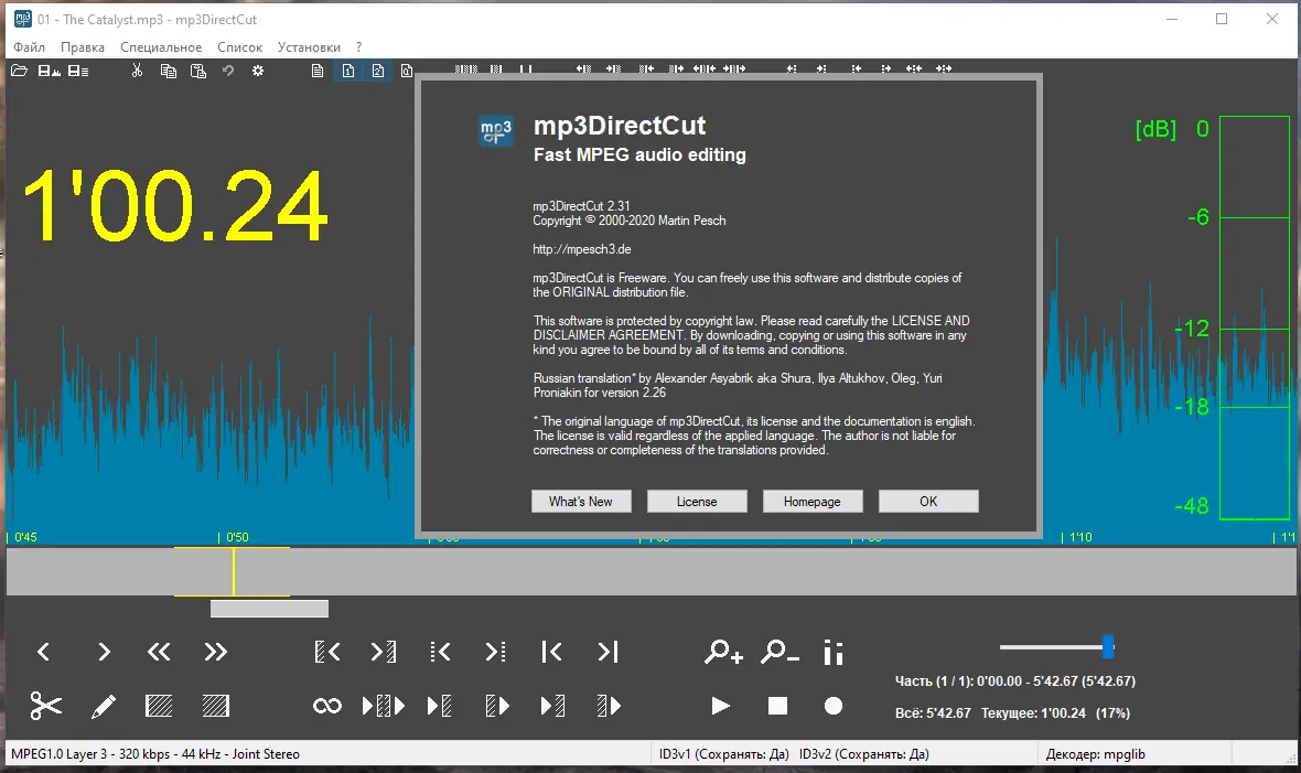 - Поддержка пакетной обработки, cue-листов и автоматического определения пауз.