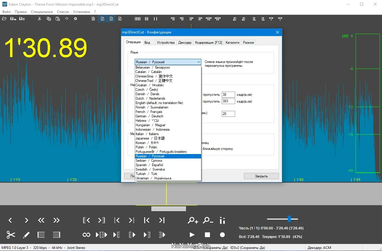 - Интеграция с внешними кодеками LAME и ACM для записи новых MP3-файлов.