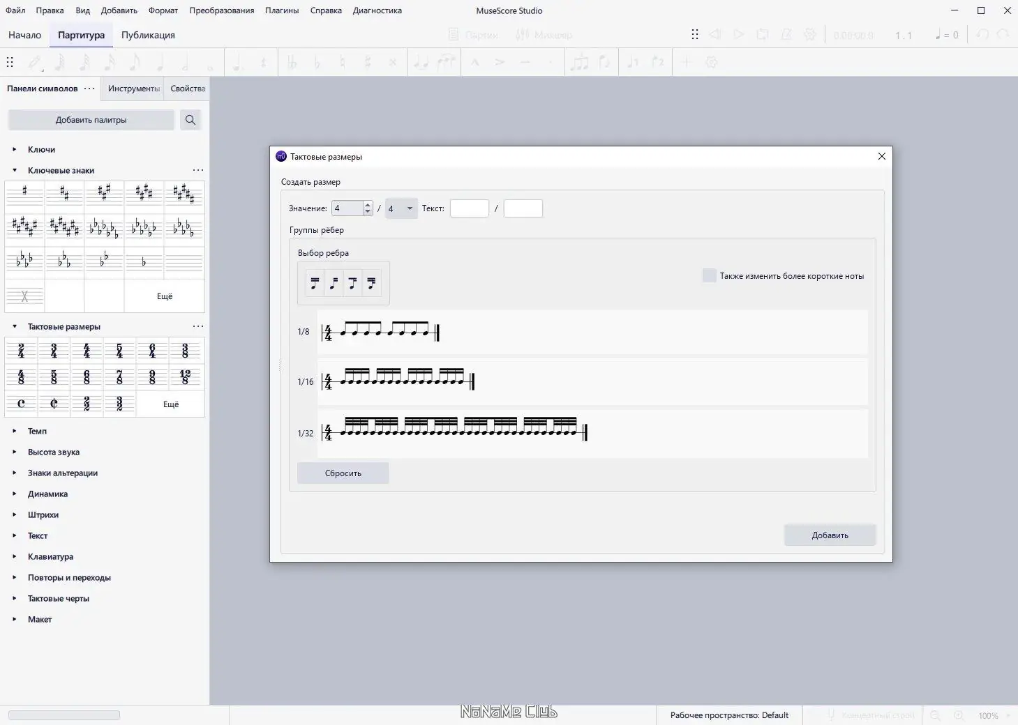 - Программа включает специальный мастер создания проектов, который помогает настроить параметры новой партитуры, включая тональность, размер такта и количество тактов.