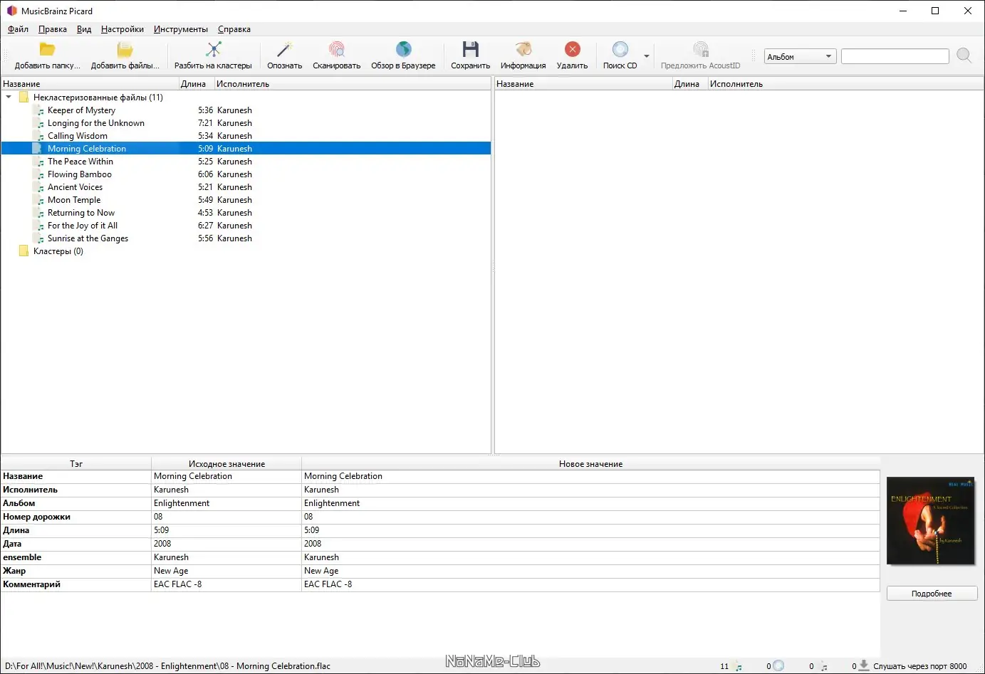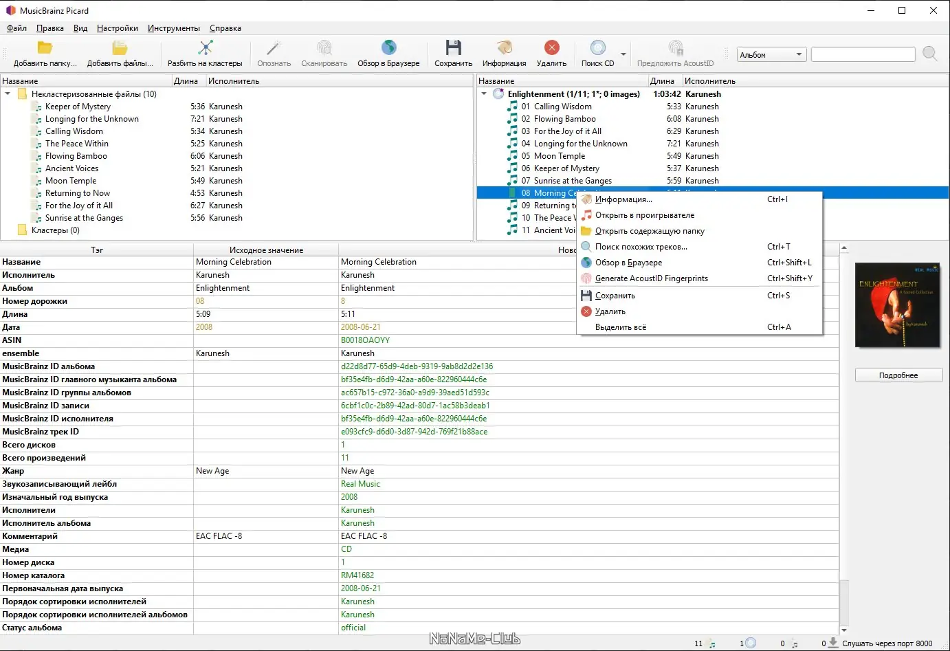 Интерфейс программы организован логично: после запуска можно перетащить файлы или папки в рабочую область для анализа. Каждый трек проходит через акустический идентификатор, который сравнивает его с записями в базе данных. Если совпадение найдено, Picard автоматически заполняет все доступные поля, включая номер дорожки, жанр и изображение альбома. При необходимости пользователь может вручную корректировать теги, добавлять недостающие данные или загружать обложки вручную. Также доступна функция пакетной обработки, что особенно удобно при сортировке целых альбомов.