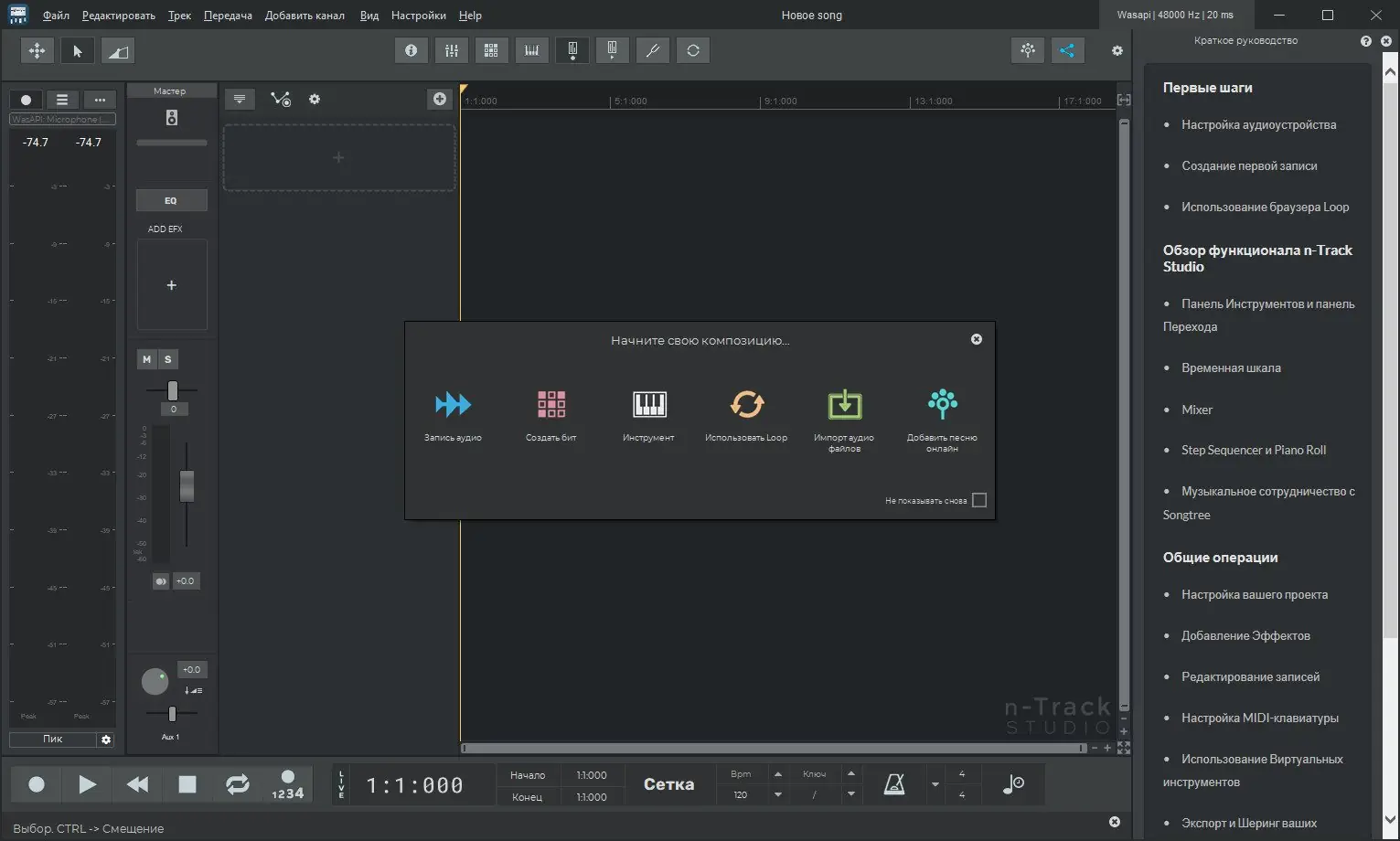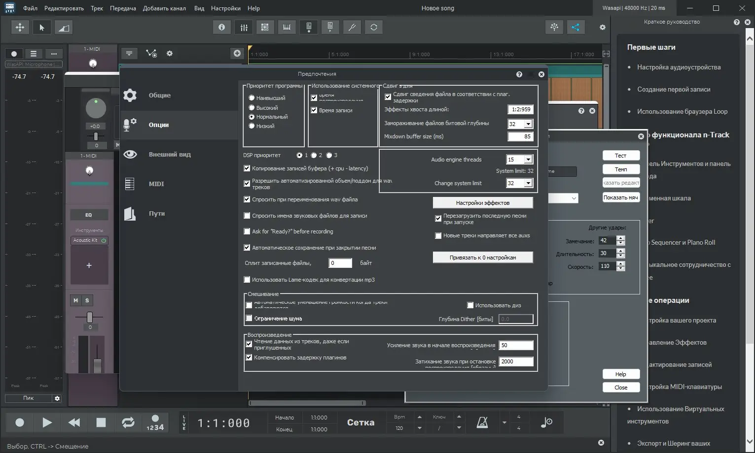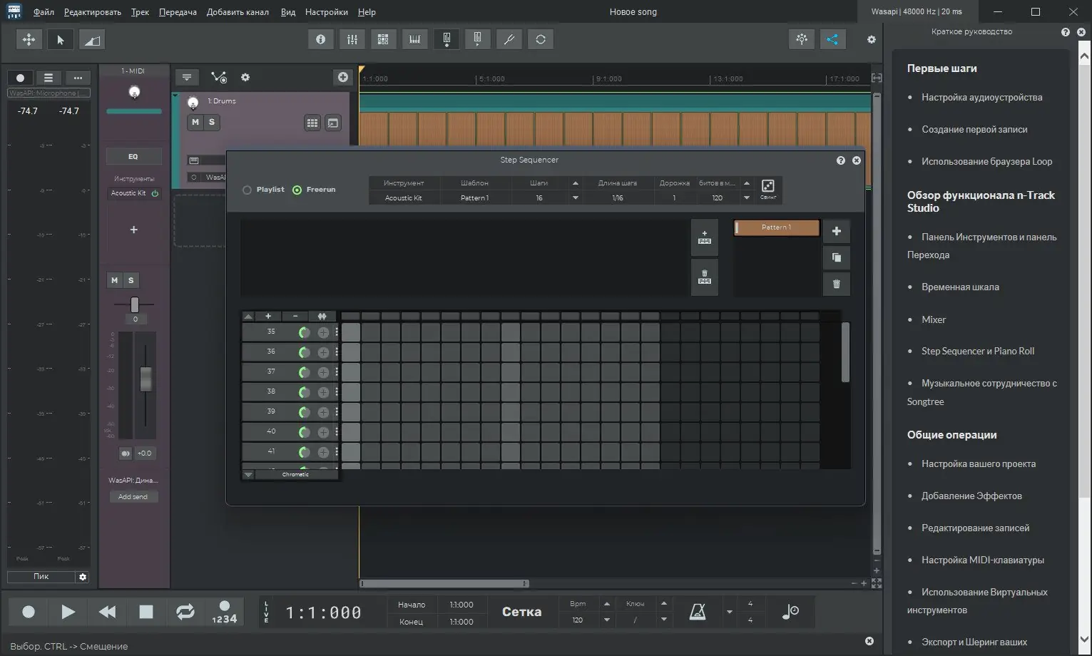 Работа с n-Track Studio Suite начинается с создания нового проекта, где можно добавлять аудио- и MIDI-дорожки в любом количестве. Для записи используется встроенный рекордер с поддержкой высоких частот дискретизации до 192 кГц и разрешением 24 бита. MIDI-данные редактируются с помощью Piano Roll и Step Sequencer, что позволяет точно настраивать ноты, длительность и динамику. Встроенный тюнер помогает быстро настроить инструменты перед записью, а Screen Drumkit даёт возможность играть на виртуальных ударных прямо с экрана.