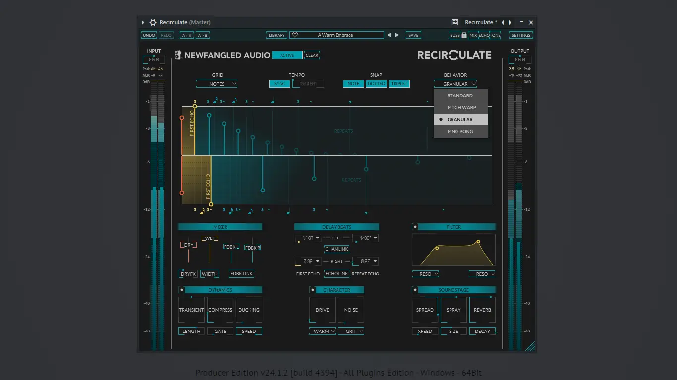 - Три режима задержки — стандартный, Pitch Warp и Granular — обеспечивают разнообразие текстур, от классического эха до экспериментальных звуковых искажений.