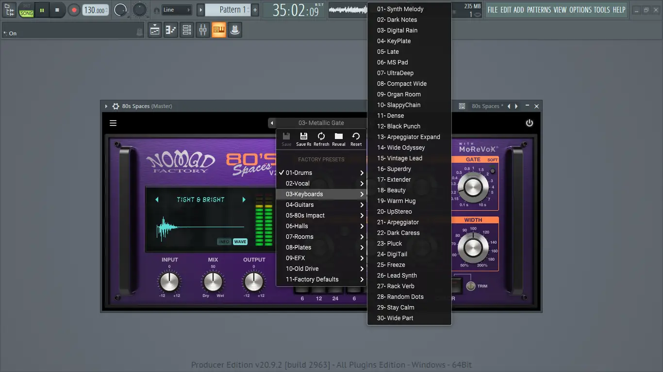 Использование 80s Spaces не требует глубоких технических знаний и интегрируется в стандартный рабочий процесс в любой цифровой аудиостудии. После установки плагина его можно загрузить в любой слот эффектов, поддерживаемый форматом vst. Основные параметры, такие как Dry/Wet, Decay, Width и фильтры, доступны на основном интерфейсе, что упрощает быструю настройку. Новые пресеты можно перетаскивать прямо в окно плагина, что особенно удобно при работе в Reason или других DAW с поддержкой drag & drop.