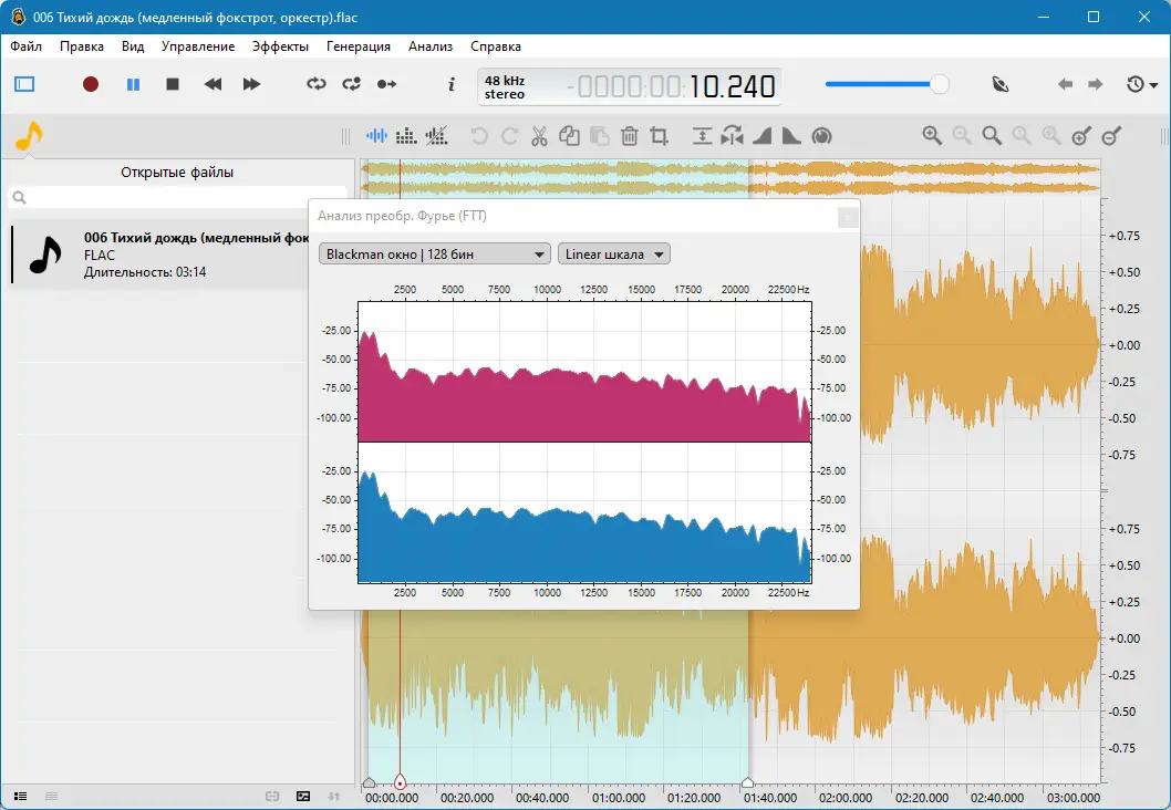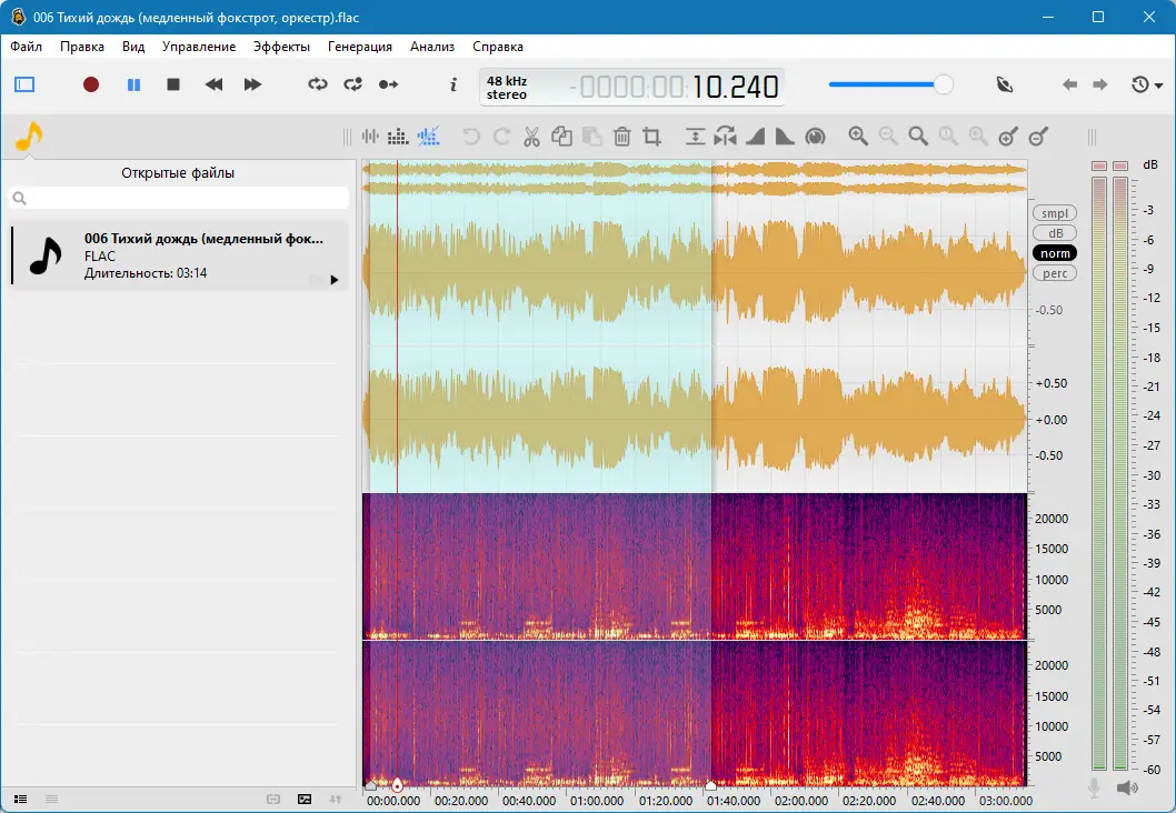 После запуска программы достаточно перетащить аудиофайл в рабочую область или открыть его через меню. Интерфейс отображает форму волны, а при необходимости можно переключиться на спектрограмму для анализа частотного состава. Для применения эффектов, таких как эквалайзер, шумоподавление или усиление, используется панель эффектов с возможностью предпрослушивания изменений до их применения. Множественный выбор позволяет выделять несмежные участки, что удобно при обработке диалогов или удалении пауз. Все действия выполняются в несколько кликов, а изменения отображаются мгновенно.