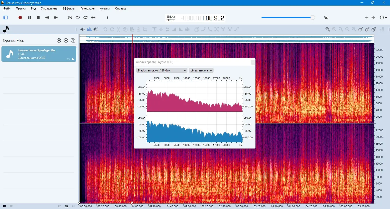 - Отображение спектрограммы с настройкой параметров в реальном времени: количество полос, тип окна, динамический диапазон.