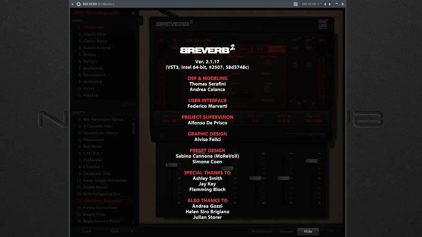 Overloud BREVERB 2 — это алгоритмический ревербератор нового поколения, ориентированный на точное воспроизведение звучания культовых устройств, таких как Lexicon 224 и Lexicon 480. Программа моделирует не только основные параметры реверберации, но и характеристики аналоговых цепей A/D и D/A преобразования, что делает звук максимально приближенным к оригиналу. Каждый из семи основных алгоритмов — Hall, Room, Plate, Inverse, Spaces small, Spaces big и Sources — разрабатывался без компромиссов в качестве, обеспечивая чистоту и глубину звучания.
