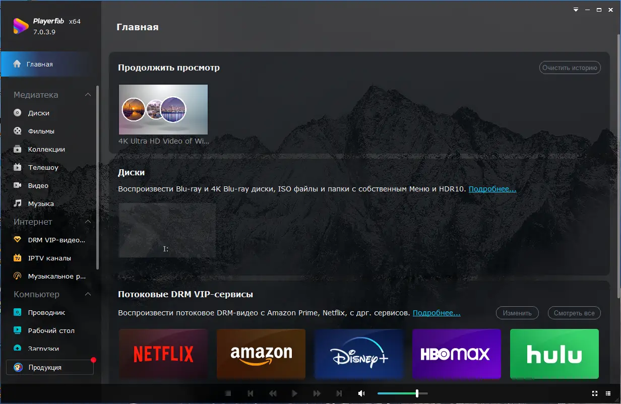 PlayerFab — это современный медиапроигрыватель, ориентированный на воспроизведение локальных видеофайлов, DVD, Blu-ray и UHD-дисков, а также потокового контента с популярных сервисов. Программа обеспечивает высокое качество изображения и звука, поддерживает актуальные видеокодеки и предлагает расширенные функции управления воспроизведением. С её помощью пользователь получает полный контроль над просмотром, включая пропуск рекламы, выбор аудиодорожек и субтитров, а также работу с локальной видеотекой.