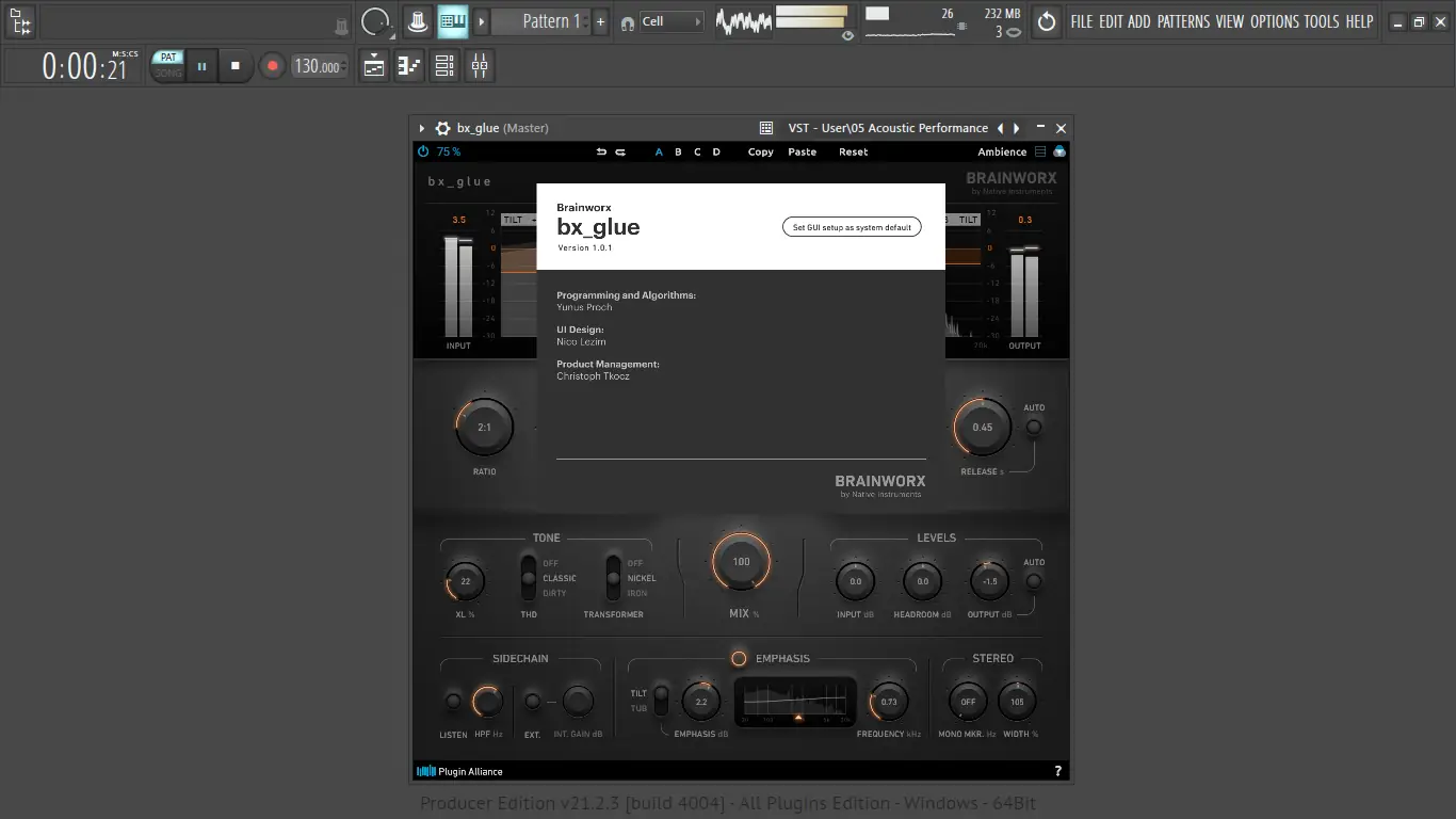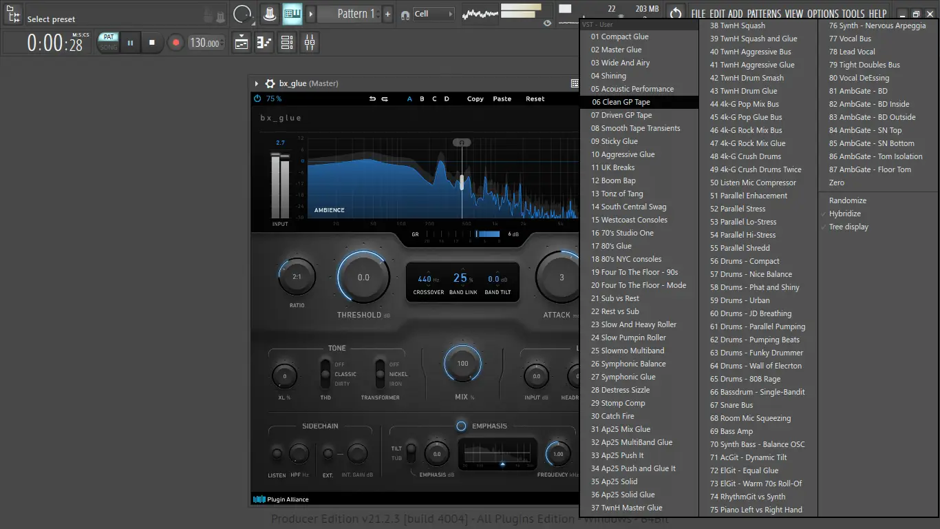 Программа bx_glue представляет собой стерео VCA-компрессор с уникальной двухполосной архитектурой, разработанный для достижения плотного и сбалансированного звучания микса. В основе лежит эмуляция классических британских bus-компрессоров, которые долгое время служили эталоном для склейки групп и стереошины. Современные функции, такие как двухдиапазонная обработка, спектральный анализ и регулируемая насыщенность, позволяют точно управлять динамикой без потери характера.