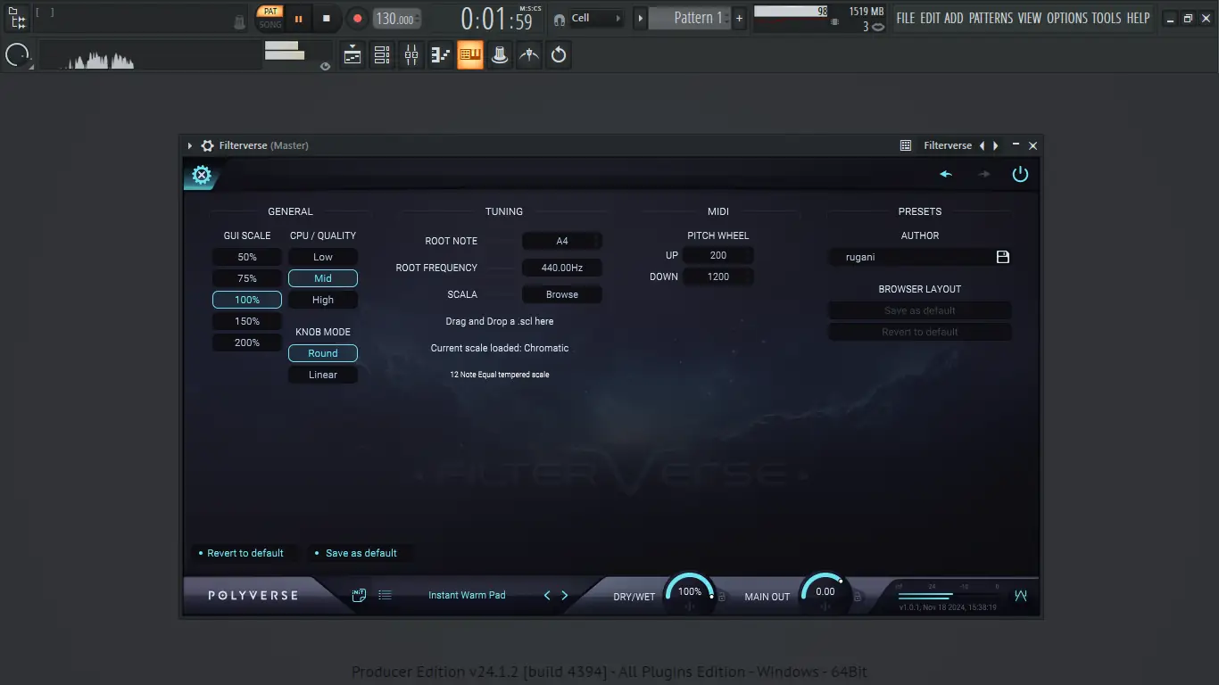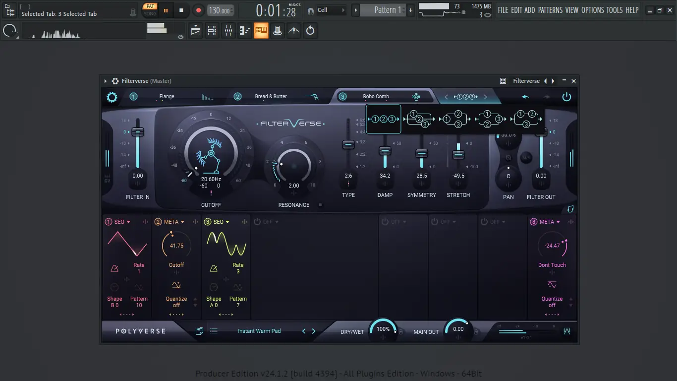 Работа с плагином начинается с загрузки Filterverse в DAW как VST, AU или AAX-модуля. После добавления на трек пользователь может выбирать фильтры, комбинировать их и настраивать маршрутизацию через встроенный редактор сигналов. Основной интерфейс отображает параметры фильтрации, модуляции и пространственной обработки, с возможностью перетаскивания модуляторов на нужные параметры для быстрого назначения.