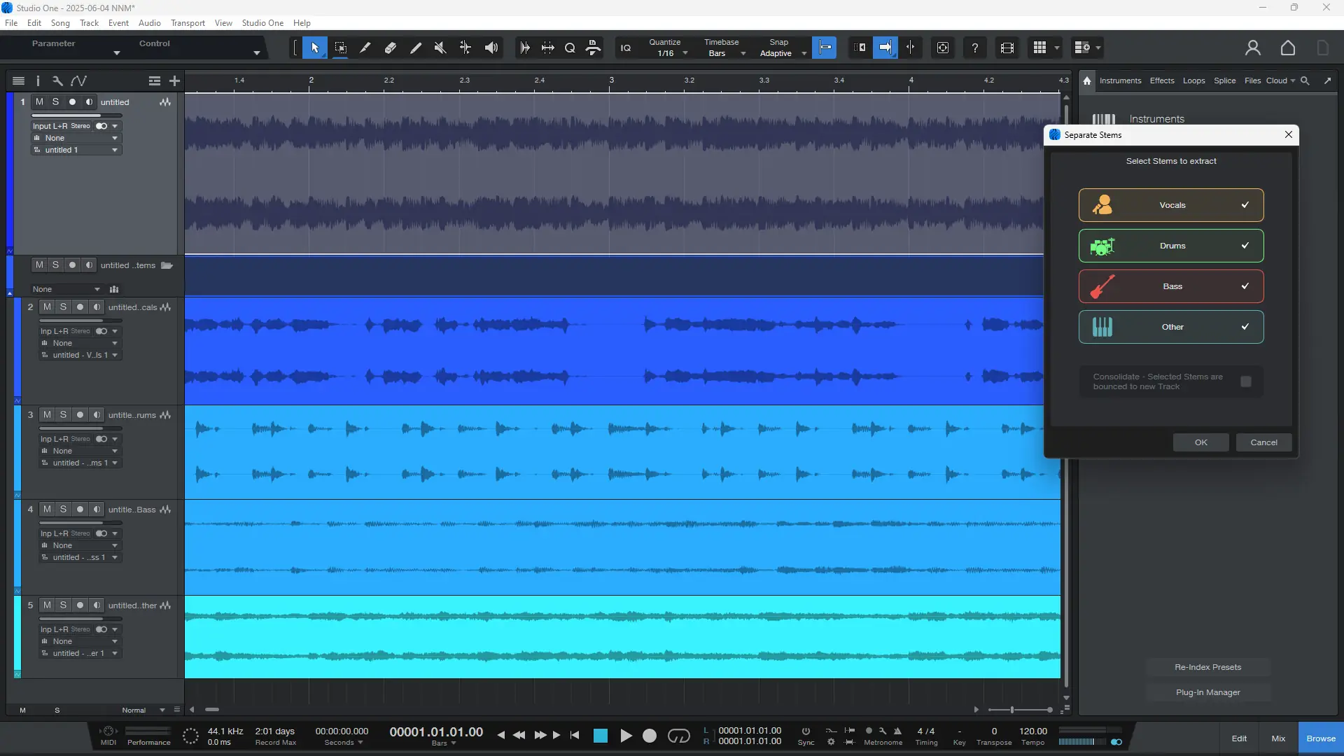 - Разделение стемов с помощью встроенного ИИ-алгоритма помогает извлекать вокал, бас, ударные и аккорды из готового микса.