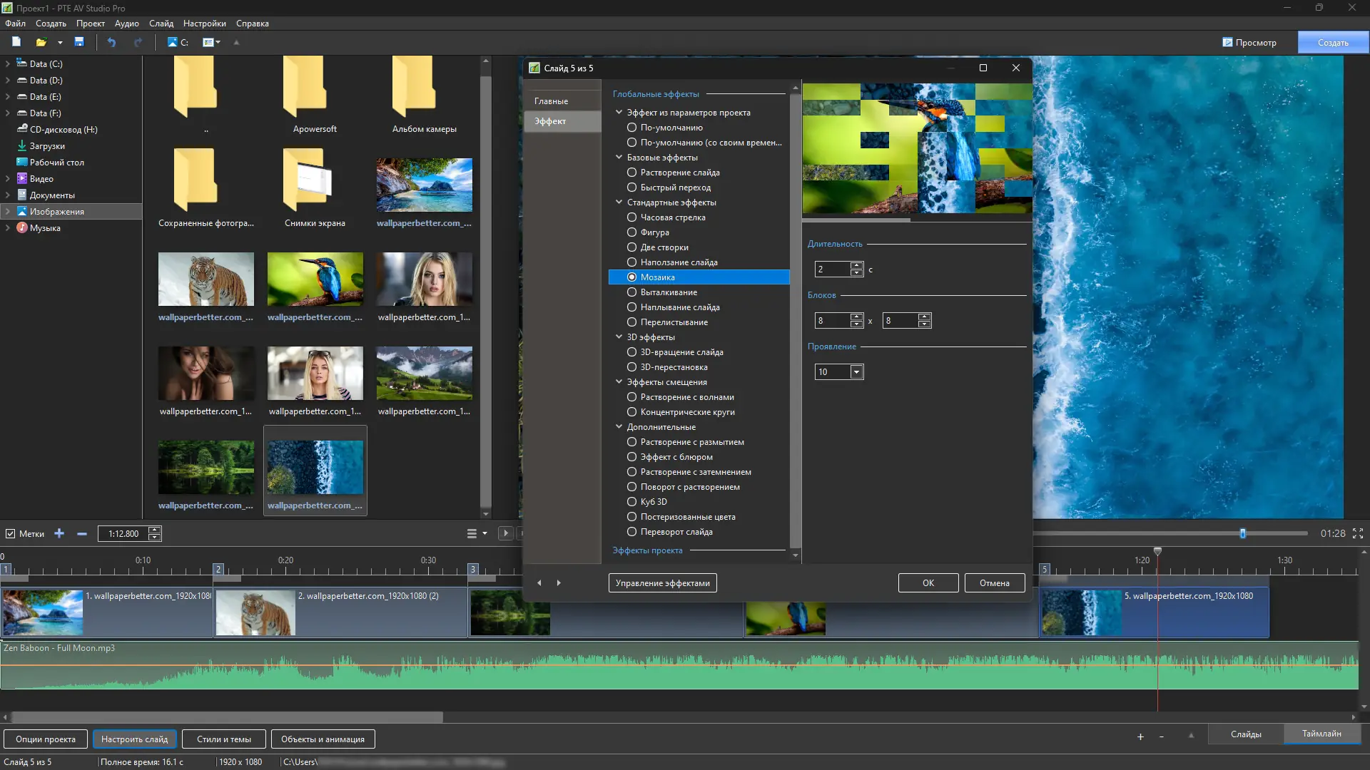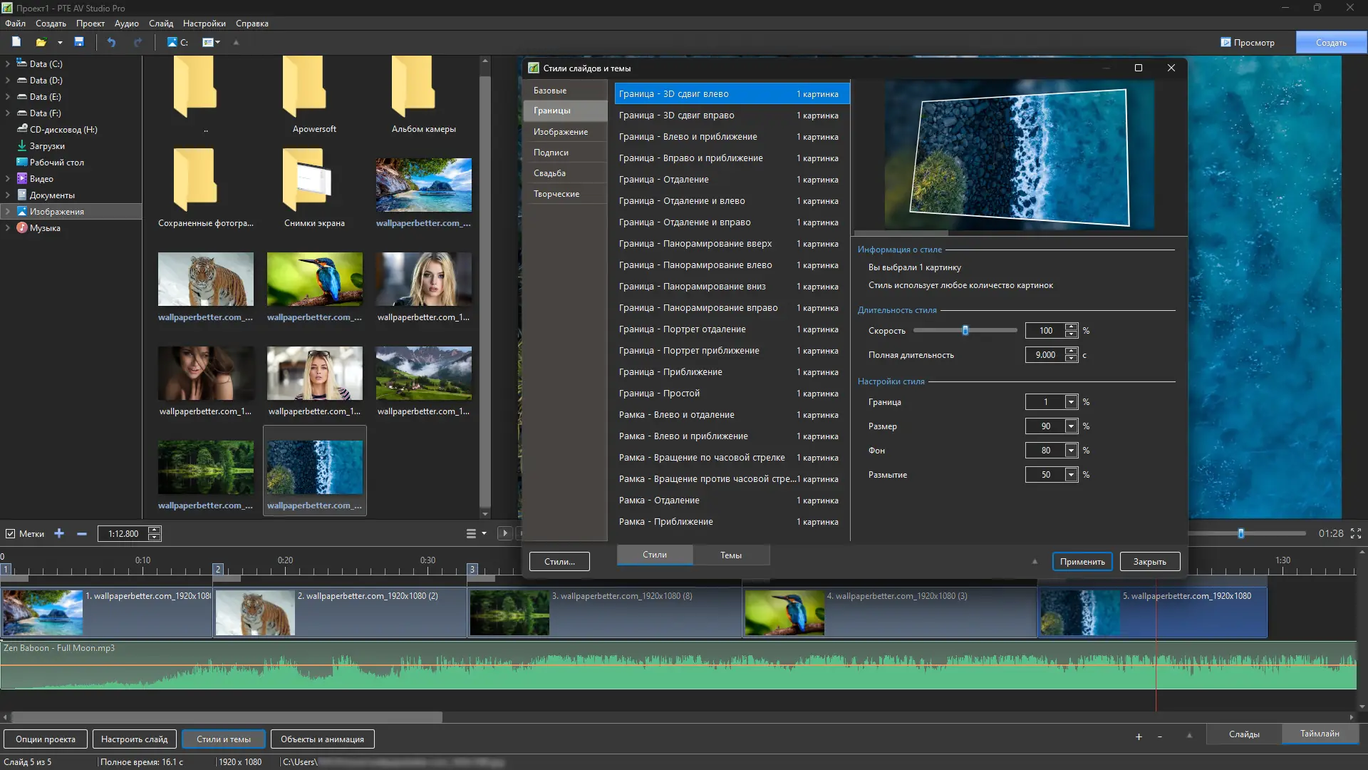 PTE AV Studio — это мощное программное решение для создания профессиональных слайд-шоу из фотографий с возможностью добавления музыки, текста и эффектов анимации. Программа позволяет экспортировать результат в виде самозапускаемого EXE-файла, видеофайла в формате HD или DVD-диска, пригодного для воспроизведения на любом компьютере. Поддержка множества аудио- и видеоформатов, а также расширенные настройки анимации делают инструмент идеальным для создания презентаций, поздравлений и мультимедийных проектов любого уровня сложности.