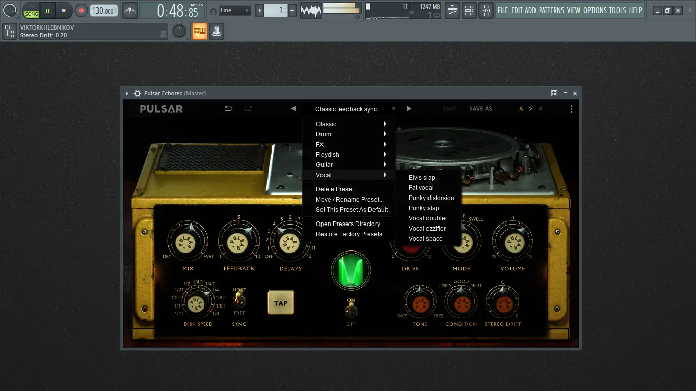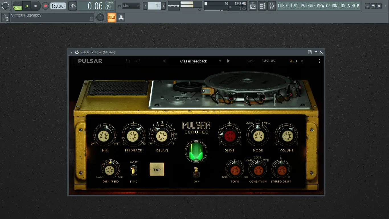 Использование Pulsar Audio — Echorec интуитивно понятно даже для начинающих пользователей цифровых аудиорабочих станций. После установки плагин доступен в списке эффектов и может быть загружен на любой трек. Основные параметры — время задержки, обратная связь, уровень выходного сигнала и насыщение — управляются с помощью крупных вращающихся регуляторов. Скорость двигателя можно изменять вручную или привязать к темпу сессии, что позволяет добиться идеальной синхронизации без ручного подсчёта. Режимы изношенных устройств активируются переключателем, добавляя характерный глитч и динамическое сжатие.
