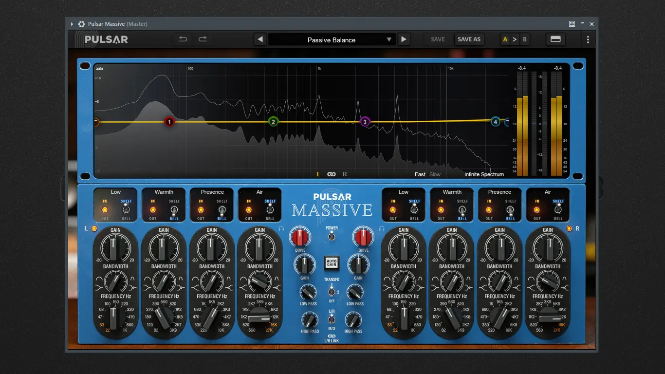- Pulsar Massive воссоздает пассивный эквалайзер Manley Massive Passive с параллельной топологией, что обеспечивает плавное взаимодействие полос и естественную коррекцию частот.