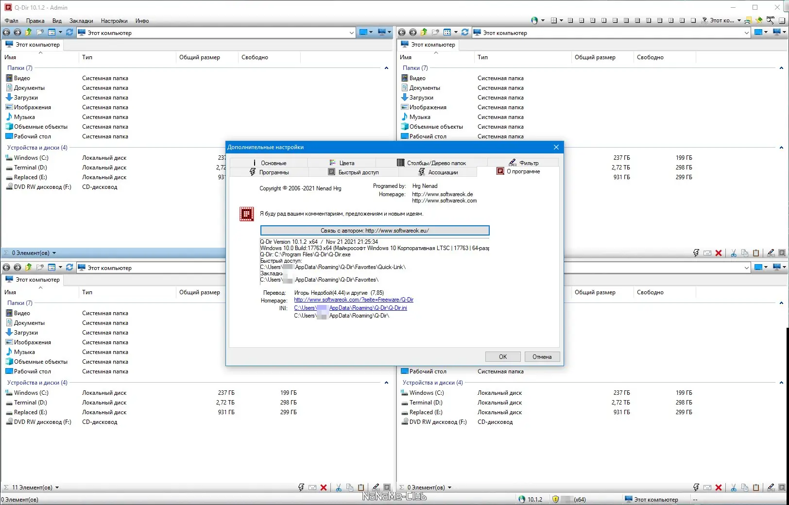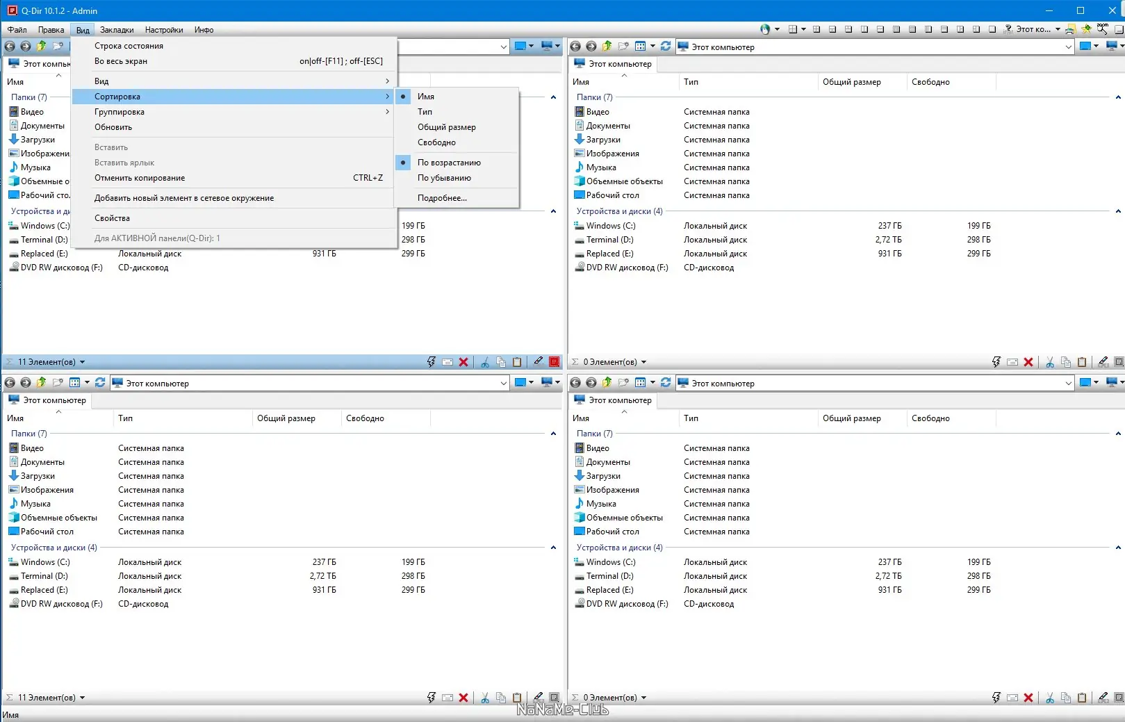 Q-Dir — это компактный и функциональный файловый менеджер с уникальным четырёхпанельным интерфейсом, обеспечивающий удобную навигацию по дискам, сетевым ресурсам и архивам. Программа поддерживает работу с ZIP, FTP, ярлыками и системными папками, а также предлагает режим предварительного просмотра, экспорт данных и настройку цветового выделения файлов. Благодаря портативной версии, Q-Dir можно запускать с любого USB-носителя без установки.