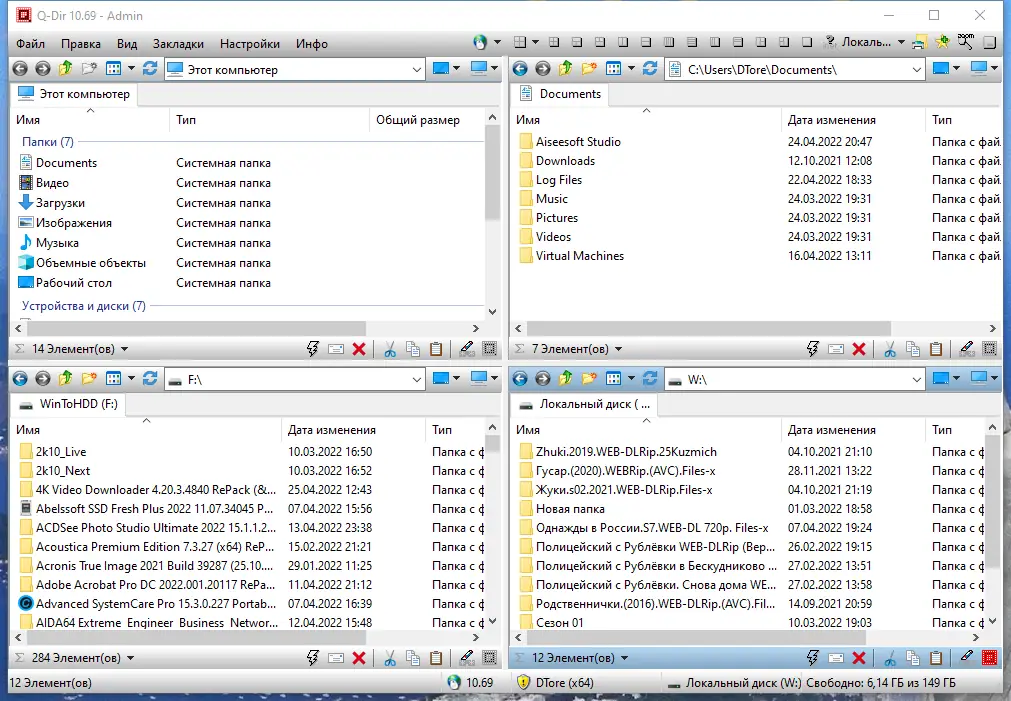 Q-Dir — это многофункциональный файловый менеджер с уникальным четырёхпанельным интерфейсом, обеспечивающий удобную работу с файлами и папками на локальных, съёмных и сетевых дисках. Программа поддерживает работу с архивами, FTP-соединениями, имеет встроенные инструменты предварительного просмотра, фильтрации и цветового выделения файлов. Благодаря портативной версии, её можно запускать с USB-накопителя без установки.