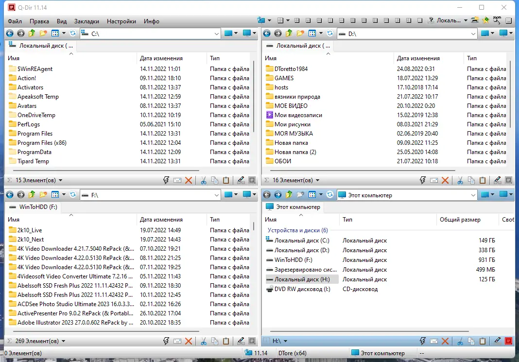Файловый менеджер Q-Dir с четырёхпанельным интерфейсом обеспечивает эффективную работу с файлами и папками, поддерживает работу с архивами, FTP, сетевыми ресурсами и съемными носителями. Программа сочетает в себе скорость, гибкость и расширенные функции просмотра и управления файловой системой.