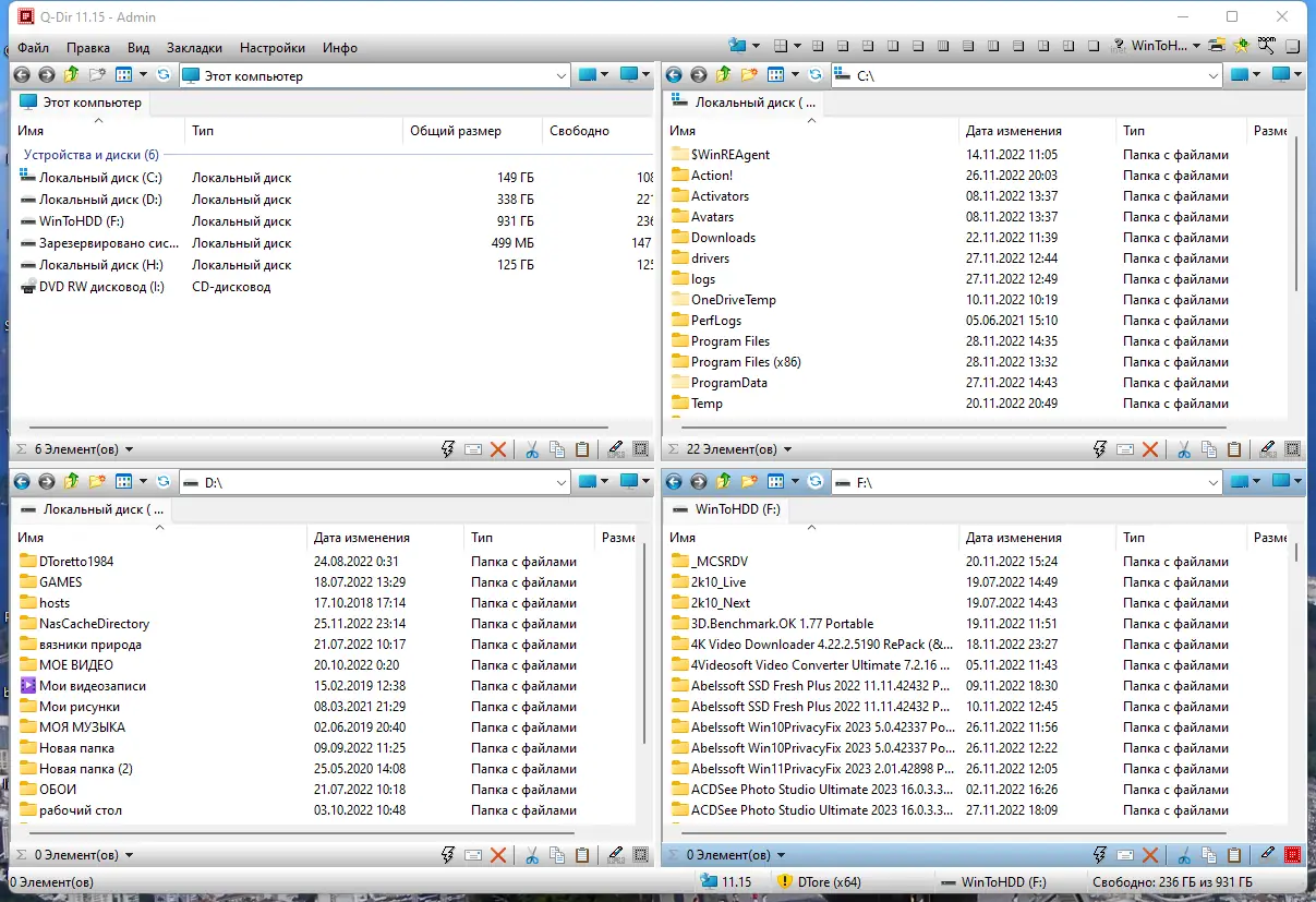 Q-Dir представляет собой многофункциональный файловый менеджер, разработанный для повышения производительности при управлении файловой системой. Основная особенность программы — четырёхпанельный интерфейс, позволяющий одновременно просматривать содержимое нескольких каталогов. Это особенно полезно при копировании, перемещении или сравнении файлов между разными директориями. Каждая панель может быть настроена независимо: можно использовать режим одной, двух или четырёх панелей в зависимости от задачи и предпочтений пользователя.