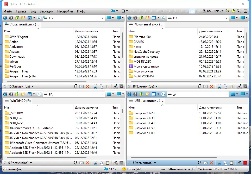 Q-Dir — это файловый менеджер с четырехпанельным интерфейсом, обеспечивающий удобную навигацию по файловой системе, быстрый доступ к папкам и эффективную работу с файлами различных типов, включая архивы и сетевые ресурсы. Программа совместима с USB-устройствами, поддерживает drag & drop, работу с буфером обмена и предварительный просмотр файлов. Её портативная версия позволяет запускать приложение без установки.