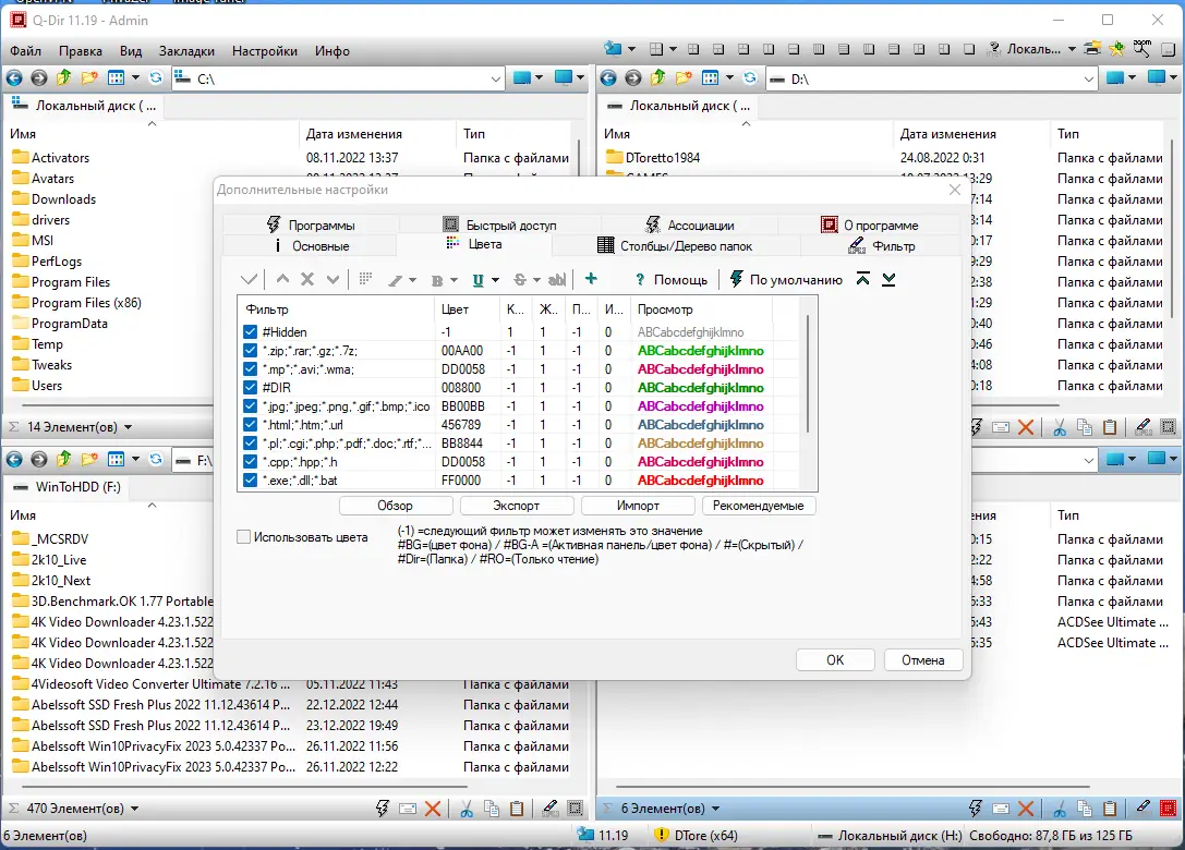 - Гибкая настройка отображения файлов, включая цветовую индикацию по расширениям и фильтрацию по типу