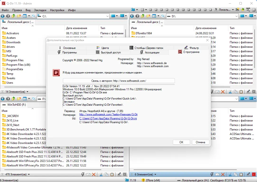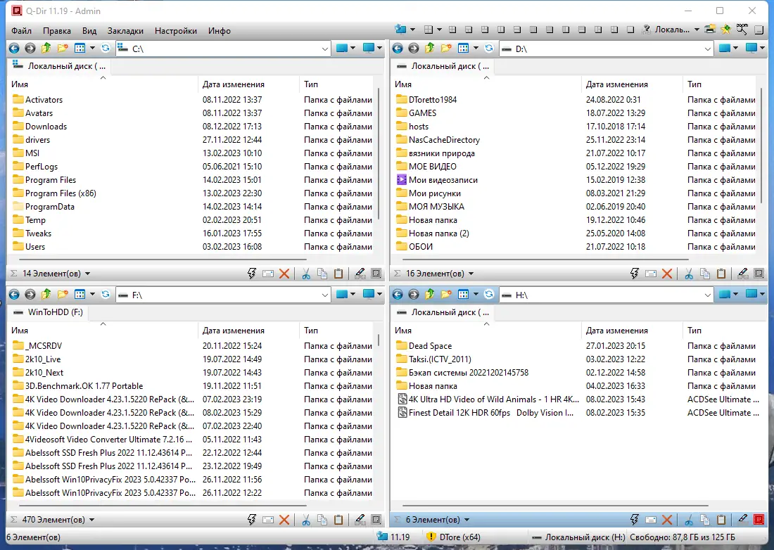 Четырёхпанельный интерфейс делает Q-Dir незаменимым инструментом для пользователей, которым требуется одновременный доступ к множеству директорий.