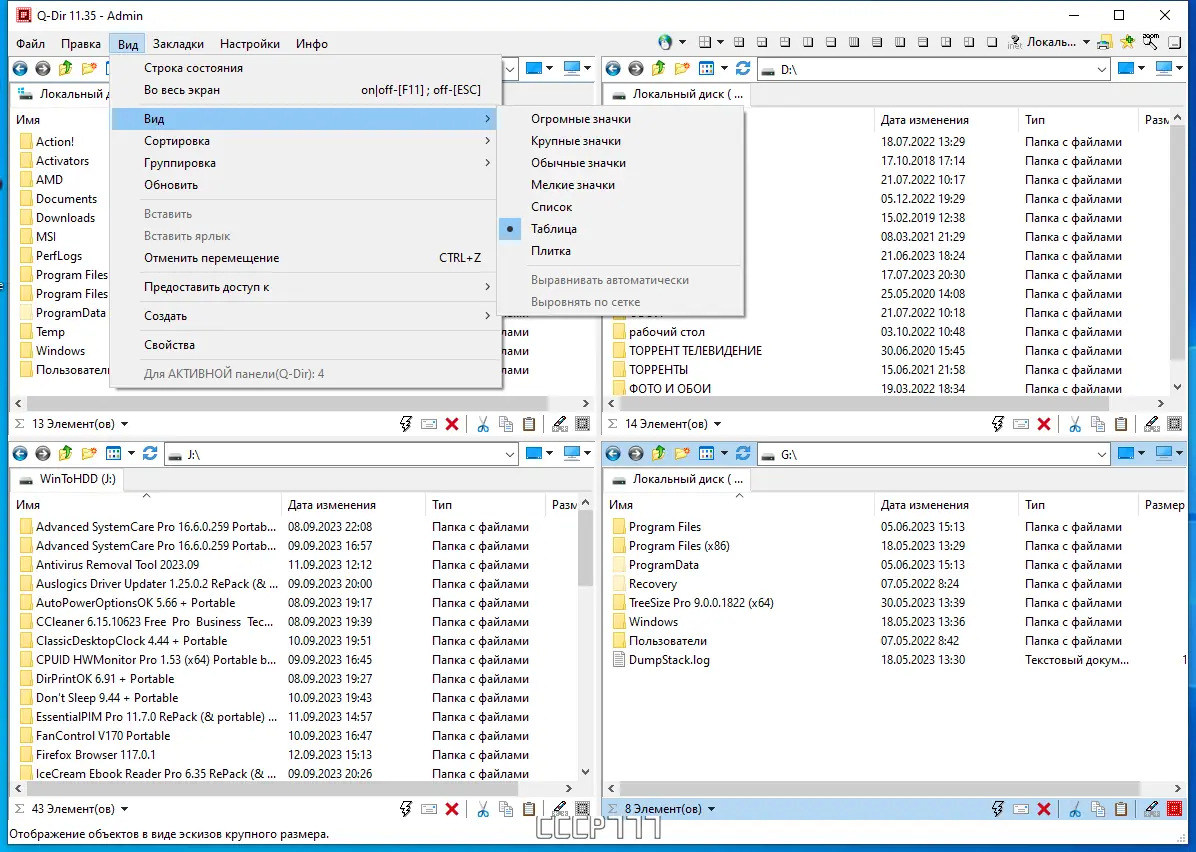 Q-Dir — это многофункциональный файловый менеджер с уникальным четырёхпанельным интерфейсом, обеспечивающий высокую производительность при работе с файлами и папками. Программа поддерживает различные типы хранилищ, включая ZIP-архивы, FTP-соединения и сетевые диски, а также предлагает инструменты для быстрого доступа, фильтрации, предварительного просмотра и экспорта данных. Её портативная версия позволяет запускать приложение без установки, что делает его удобным решением для пользователей, часто меняющих рабочее окружение.