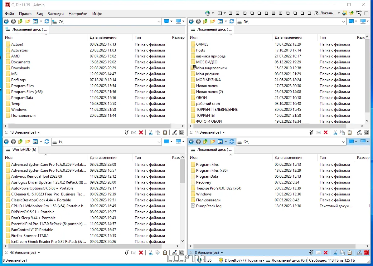 Q-Dir — это надёжный инструмент для управления файловой системой, разработанный с акцентом на удобство и скорость. Благодаря оригинальному интерфейсу с четырьмя независимыми панелями, пользователь может одновременно просматривать содержимое разных каталогов, что значительно ускоряет копирование, перемещение и сравнение файлов. Интерфейс поддерживает гибкую настройку: можно использовать одну, две или четыре панели, переключаться между вкладками и настраивать цветовое выделение для определённых типов файлов.