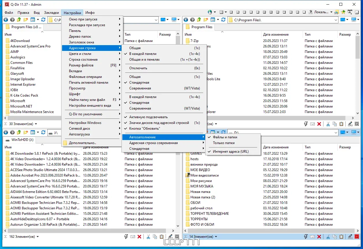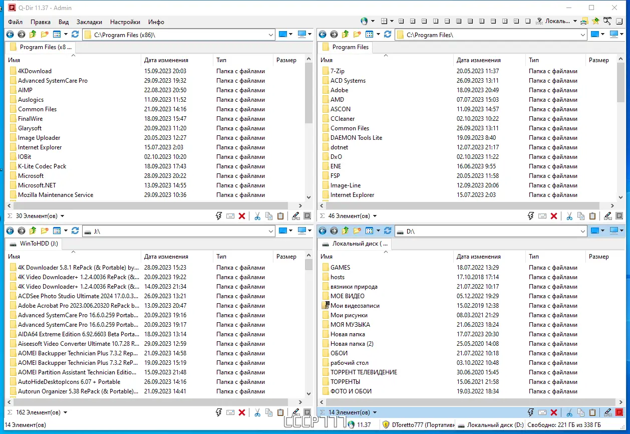 Q-Dir — это многофункциональный файловый менеджер с уникальным четырёхпанельным интерфейсом, обеспечивающий удобную навигацию по папкам и быстрый доступ к файлам. Программа поддерживает работу с архивами, сетевыми дисками, USB-накопителями и FTP-серверами. Её гибкие настройки и портативная версия делают инструмент незаменимым для повседневного управления данными.