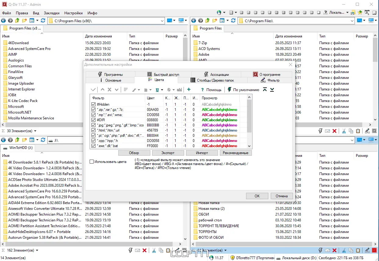 - Возможность настройки цветовой индикации расширений файлов для быстрого визуального различения