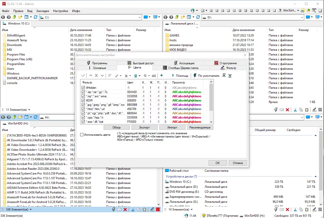 - Цветовое выделение файлов по расширению для быстрой визуальной идентификации