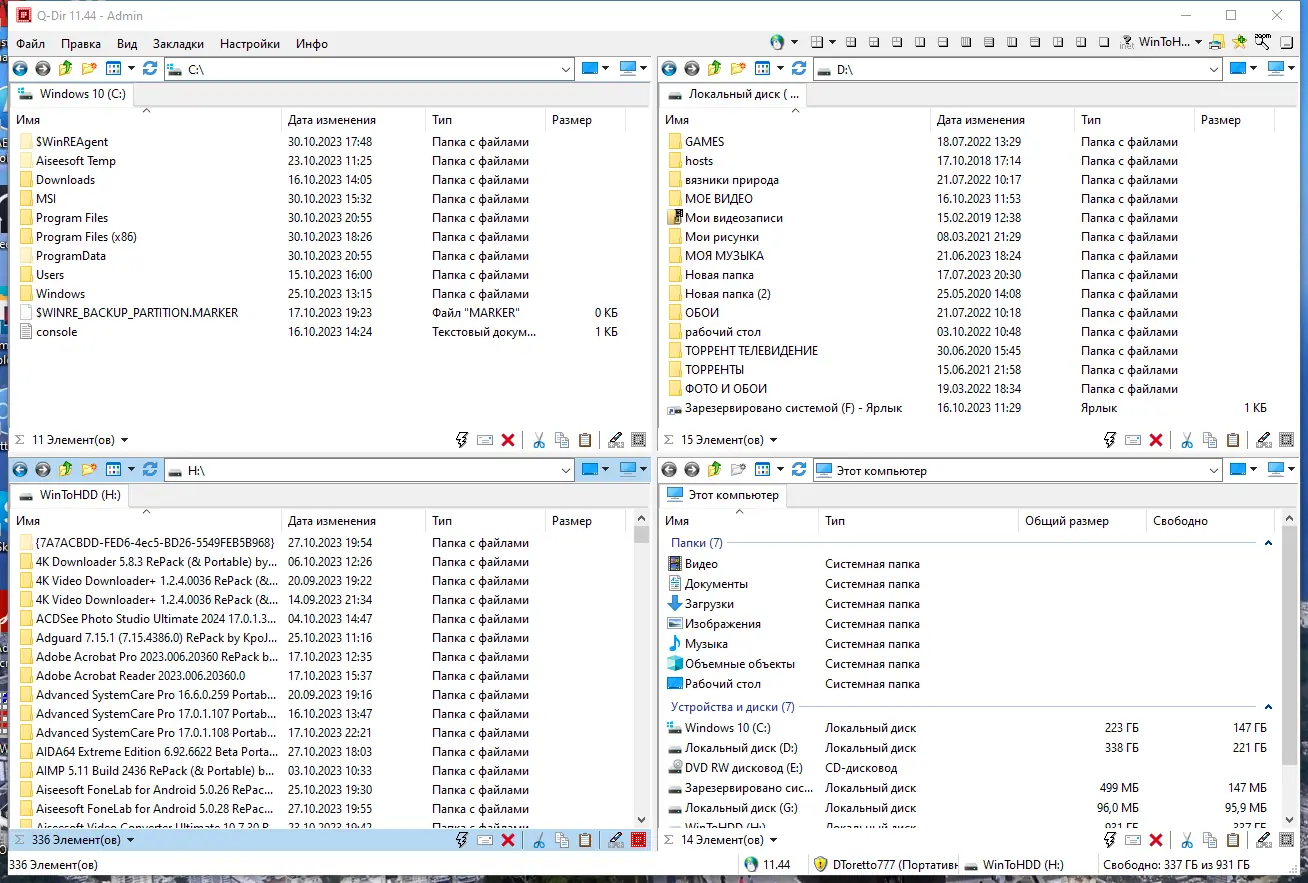 Q-Dir представляет собой компактное, но мощное приложение для управления файлами, ориентированное на пользователей, ценящих скорость и удобство. Основная особенность программы — четырёхпанельный интерфейс, позволяющий одновременно работать с разными каталогами, что значительно ускоряет процесс копирования, перемещения и сравнения файлов. Интерфейс адаптируется под нужды пользователя: можно использовать одну, две или четыре панели, включать вкладки и настраивать отображение содержимого в виде списка, таблицы или эскизов.