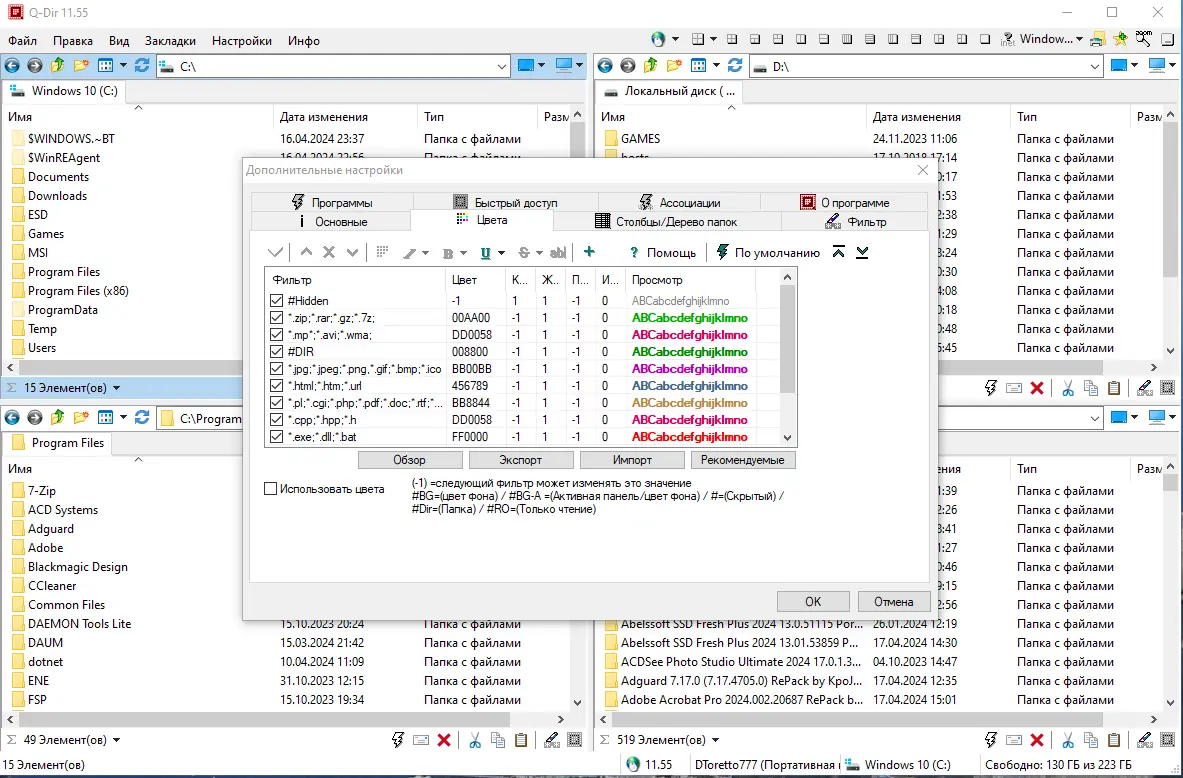 - Возможность настройки цветовой индикации для файлов по расширению, что упрощает визуальный поиск.