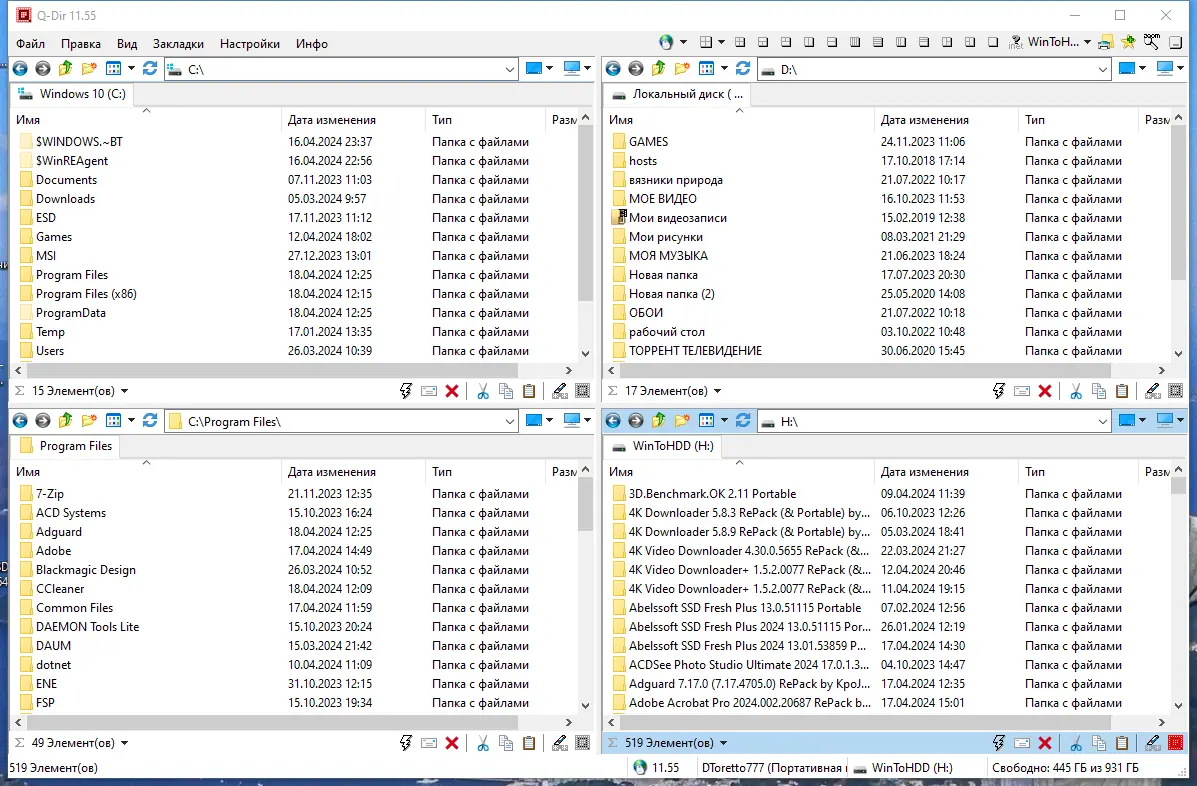 Q-Dir — это компактный и производительный файловый менеджер, ориентированный на пользователей, которым необходим быстрый доступ к разным каталогам одновременно. Основной особенностью приложения является уникальный интерфейс с четырьмя независимыми панелями, позволяющий открыть несколько директорий в одном окне. Это особенно удобно при копировании, сравнении или сортировке файлов между разными дисками или папками.