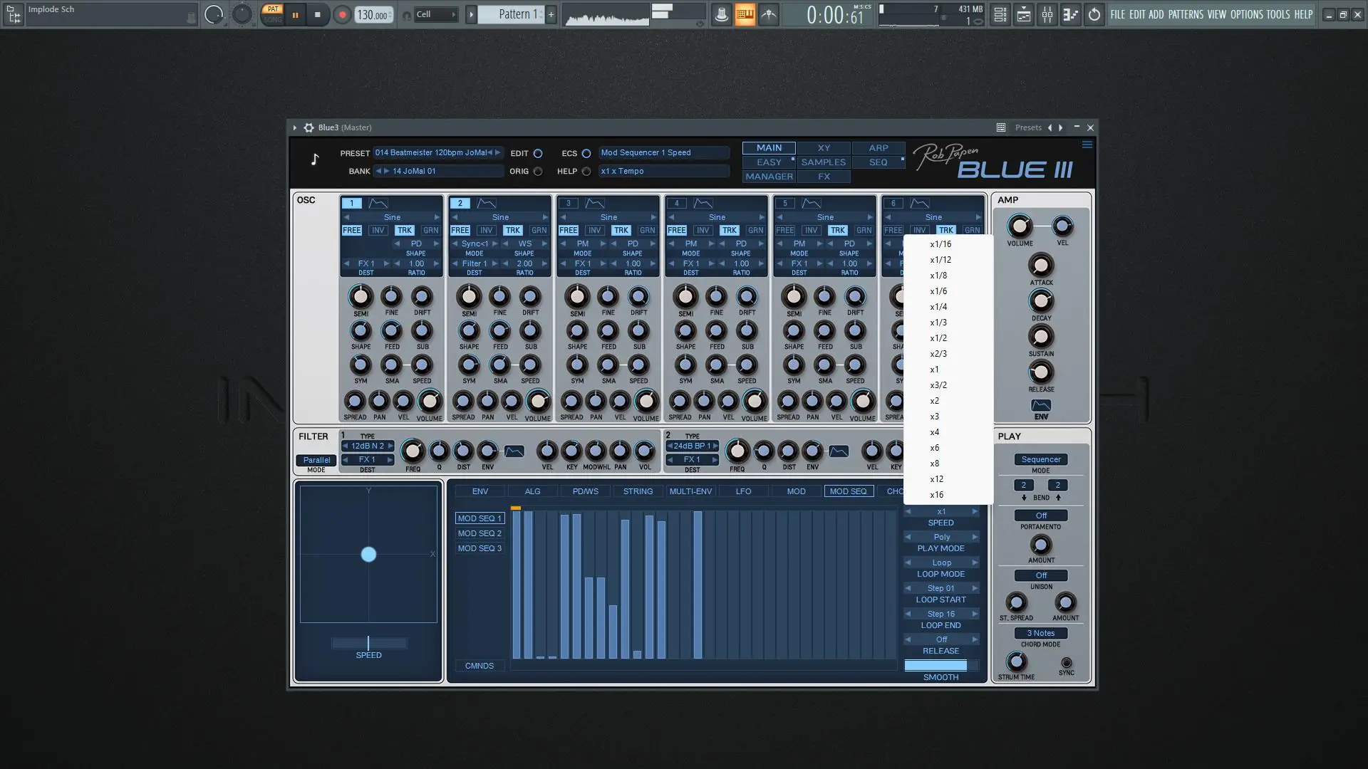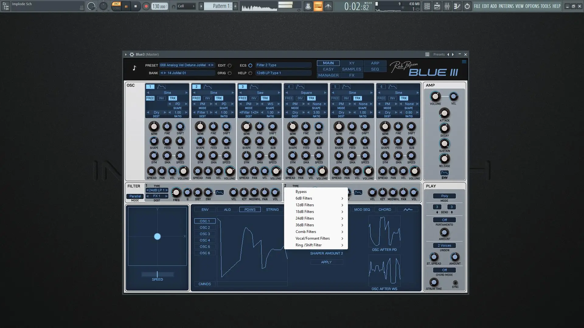 - Интеграция FM-синтеза, волновых форм, фазовых искажений и Karplus-Strong модели