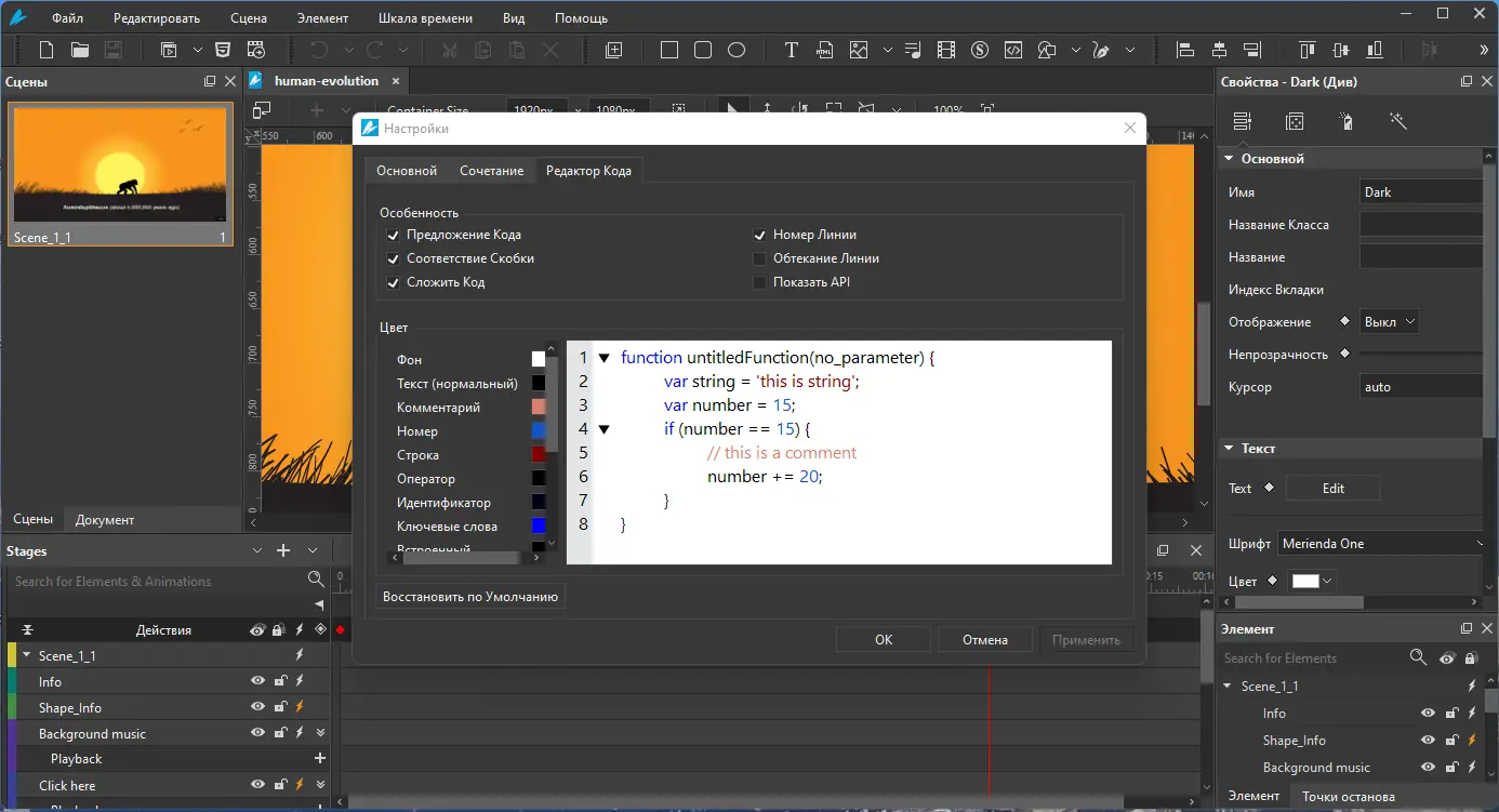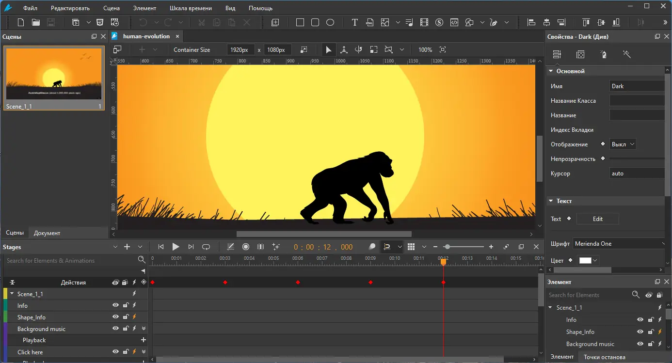 Работа с программой начинается с размещения объектов на сцене: текстов, изображений, фигур или видео. Затем с помощью инструмента анимации по ключевым кадрам задаются параметры движения — перемещение, вращение, изменение прозрачности или масштаба. Включив режим записи, пользователь может вносить изменения в реальном времени, и система автоматически создаст соответствующие ключевые кадры. Дополнительно доступны эффекты теней, градиентов и фильтров, реализованные через CSS3, что позволяет быстро улучшать визуальное восприятие проекта.