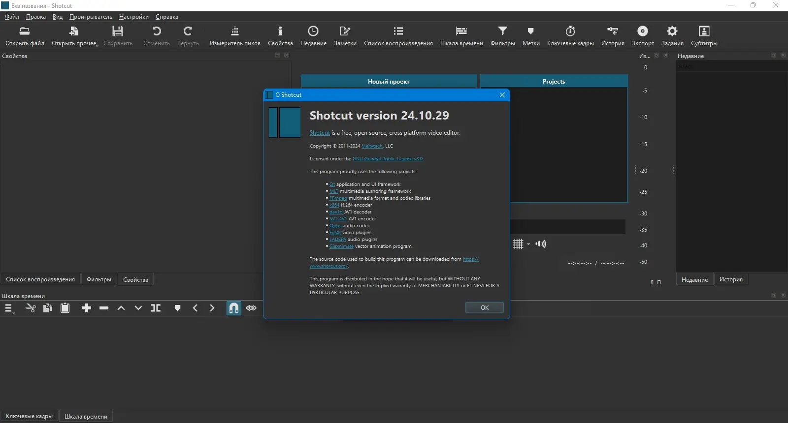 Shotcut — это мощная программа для монтажа видео с открытым исходным кодом, доступная бесплатно на русском языке. Приложение поддерживает широкий спектр форматов, предлагает инструменты для точного редактирования и кодирования без потерь. Подходит как для новичков, так и для опытных пользователей, работающих с 4K UHD и многотрековыми проектами.