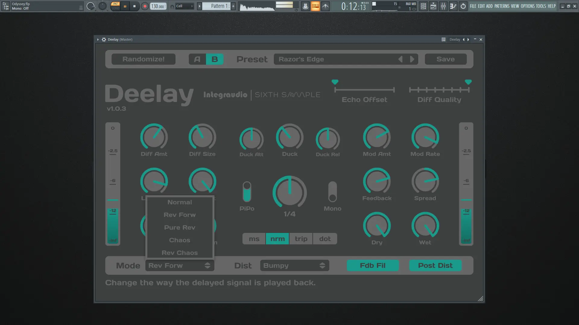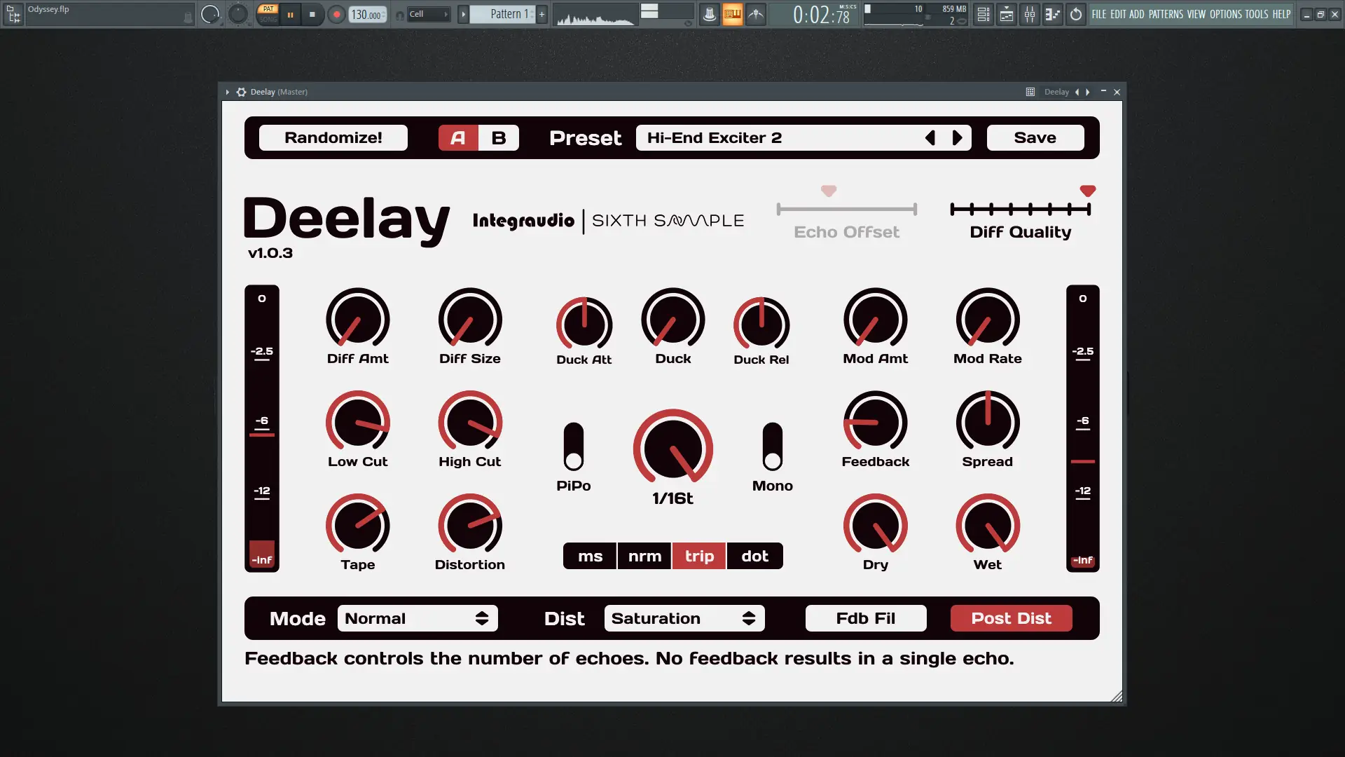 Deelay — бесплатный аудиоплагин задержки от Sixth Sample и Integraudio с пятью режимами обработки, эффектами диффузии, искажения, модуляции и широким набором пресетов для создания сложных звуковых текстур в музыкальных проектах.