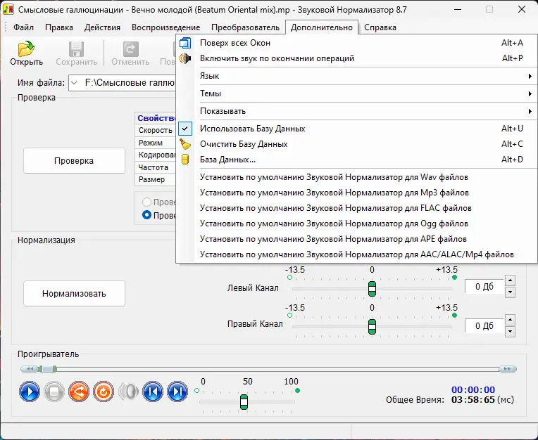 - Работа с форматами: MP3, WAV, FLAC, APE, Ogg, AAC, Mp4 и другими