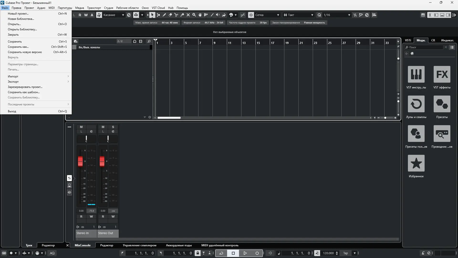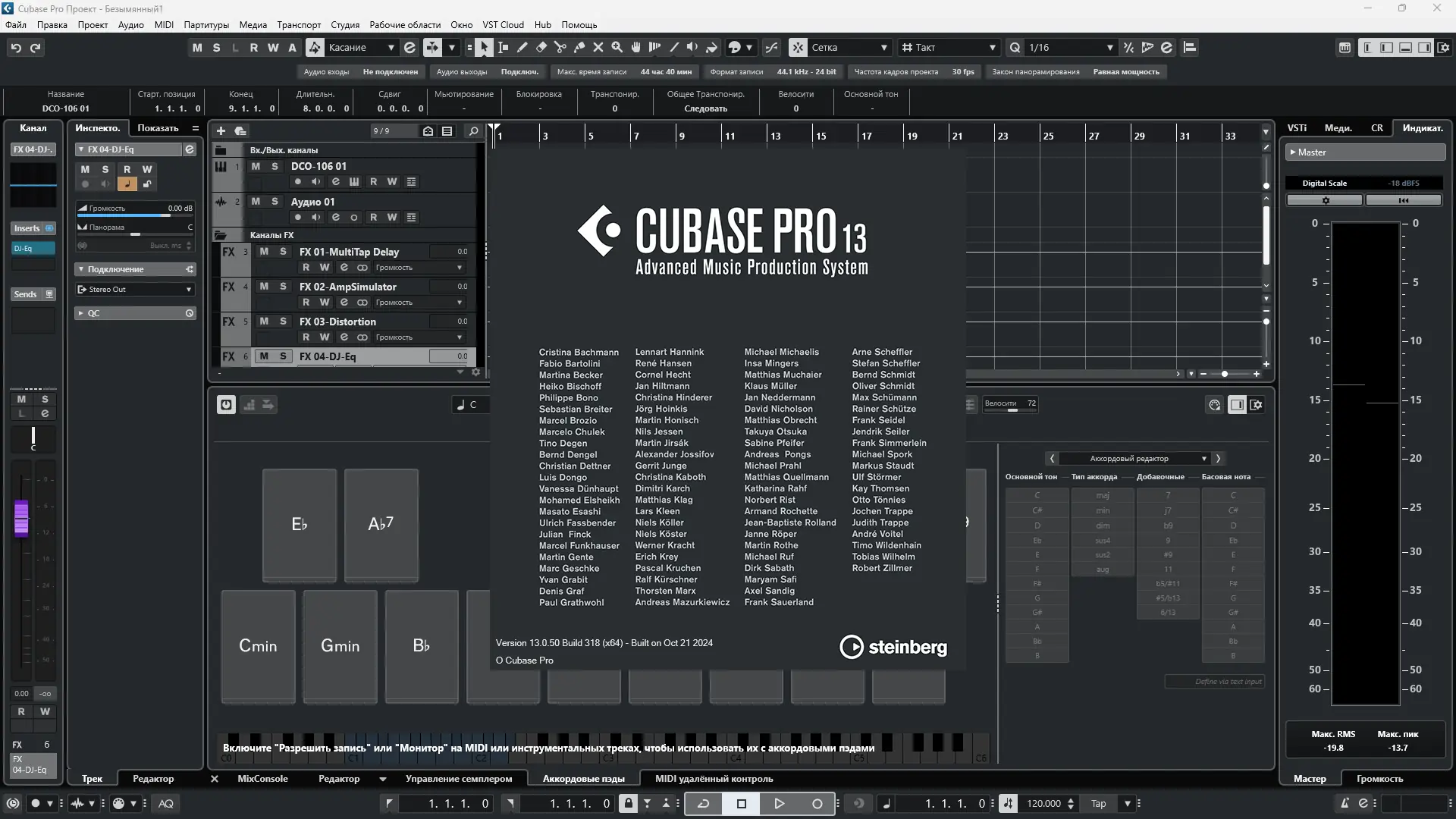 Работа с Cubase начинается с создания нового проекта, где пользователь выбирает параметры темпа, такта и формата аудиодорожек. Добавление MIDI-инструментов или аудиовходов осуществляется через мастер треков. В окне аранжировки можно размещать клипы, редактировать ноты в Key Editor, использовать Chord Pads для генерации гармонических последовательностей. Функция Tap Tempo позволяет задавать темп проекта вручную, кликая мышью в ритме. Для обработки звука применяются плагины, включая новые — Vocal Chain, Black Valve и VoxComp. Вертикальный зум, доступный через Shift+Ctrl + колесо мыши, упрощает навигацию по плотным проектам.